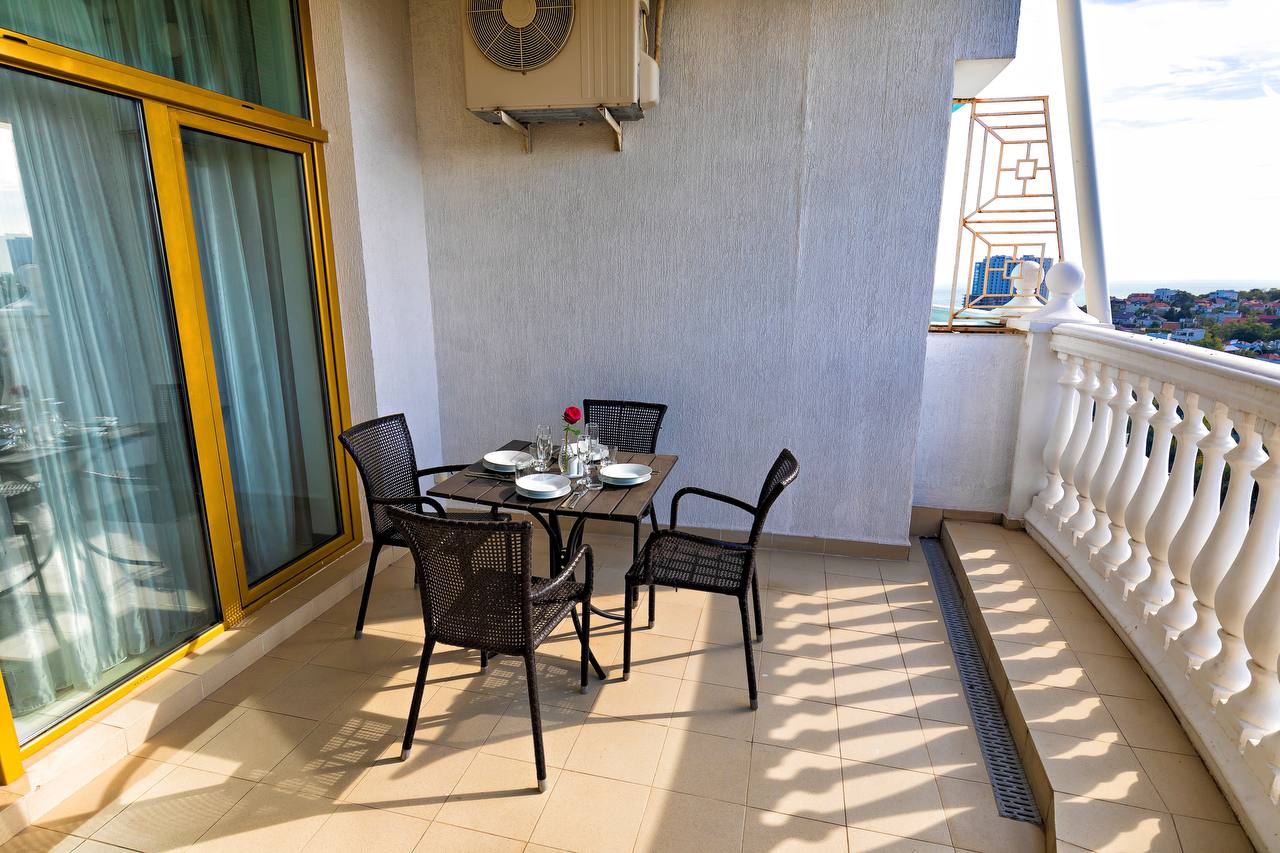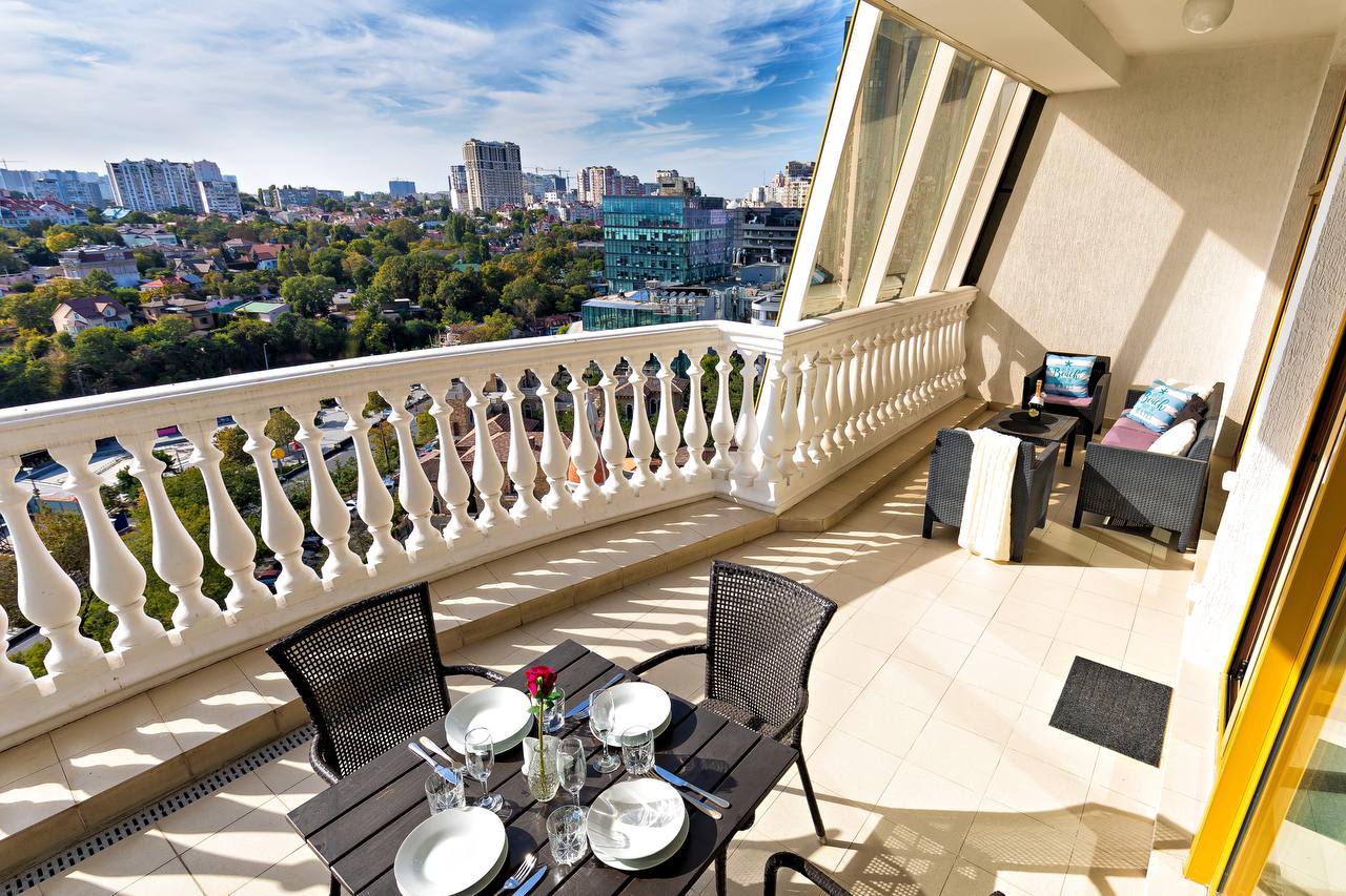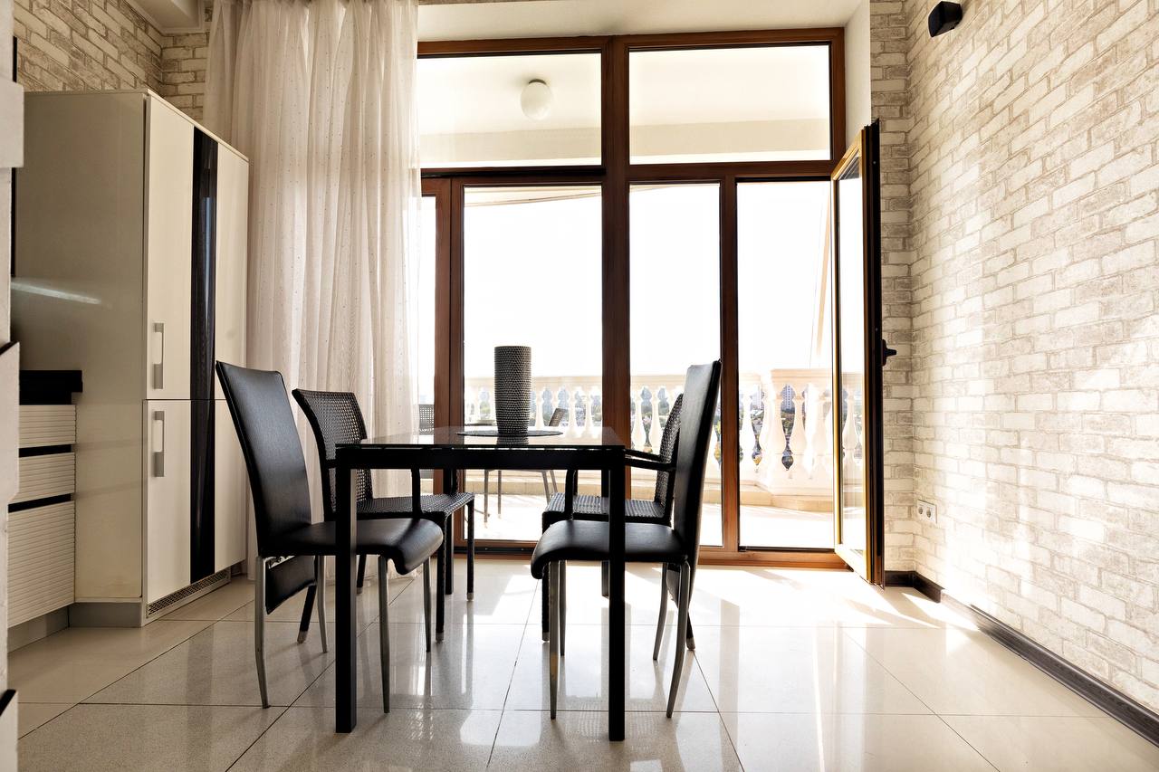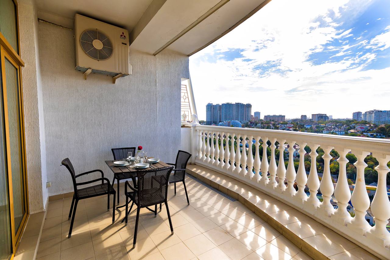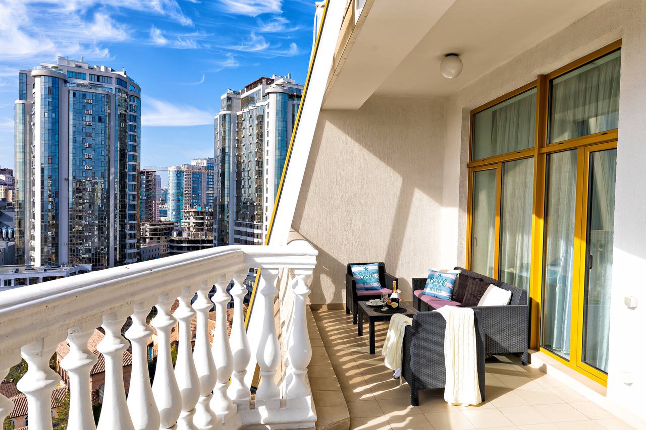 Роскошные ультрасовременные апартаменты, очень светлые и уютные, с хорошим видом на морское побережье. Эксклюзивный дизайнерский ремонт, неповторимый интерьер, высокое качество исполнения. Студийная планировка гостиной и кухни, отдельно спальня с большой двуспальной кроватью, в гостиной — диван, раскладывающийся в двуспальное место, кухня со стильными белыми фасадами, два санузла ,один из которых с ванной-джакузи и другой с душевой кабиной. Дорогой интерьер, аксессуары, мебель, ЖК телевизор, полное оснащение первоклассной техникой от известных фирм-производителей. Из гостиной — выход на большую террасу с мягкой мебелью для отдыха .