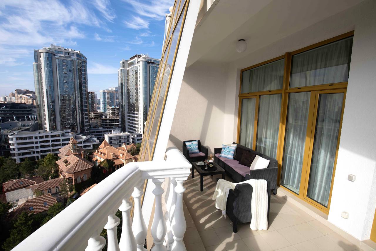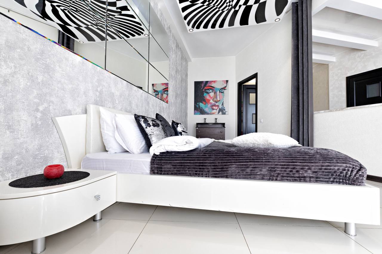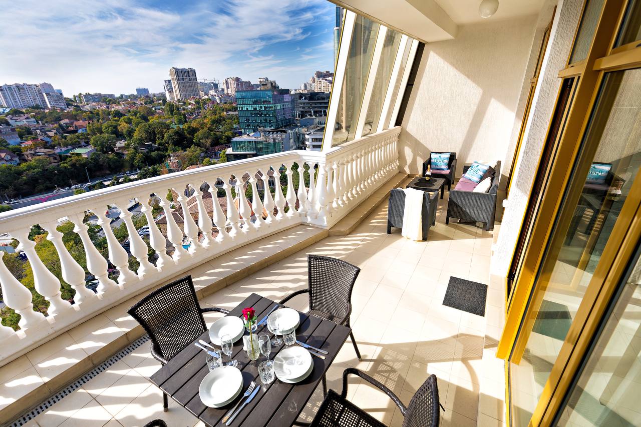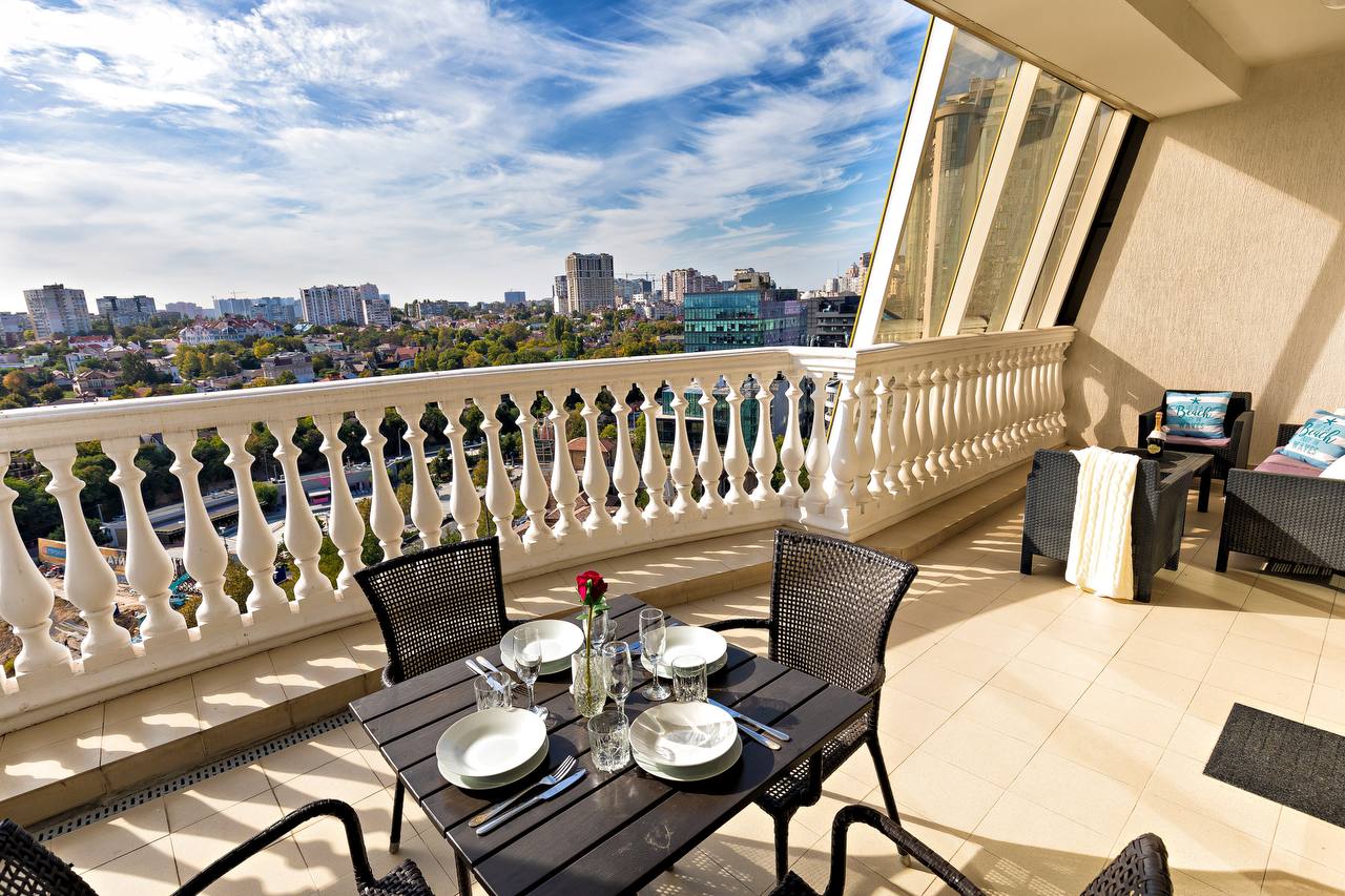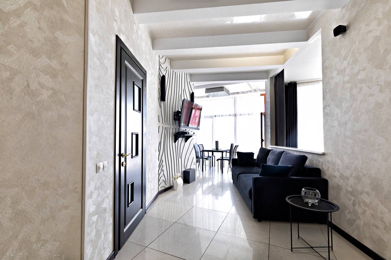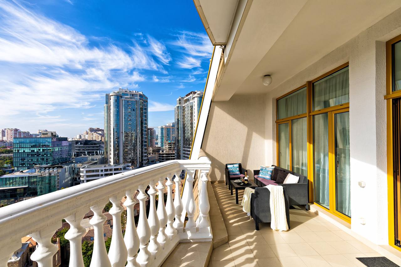 Роскошные ультрасовременные апартаменты, очень светлые и уютные, с хорошим видом на морское побережье. Эксклюзивный дизайнерский ремонт, неповторимый интерьер, высокое качество исполнения. Студийная планировка гостиной и кухни, отдельно спальня с большой двуспальной кроватью, в гостиной — диван, раскладывающийся в двуспальное место, кухня со стильными белыми фасадами, два санузла ,один из которых с ванной-джакузи и другой с душевой кабиной. Дорогой интерьер, аксессуары, мебель, ЖК телевизор, полное оснащение первоклассной техникой от известных фирм-производителей. Из гостиной — выход на большую террасу с мягкой мебелью для отдыха .