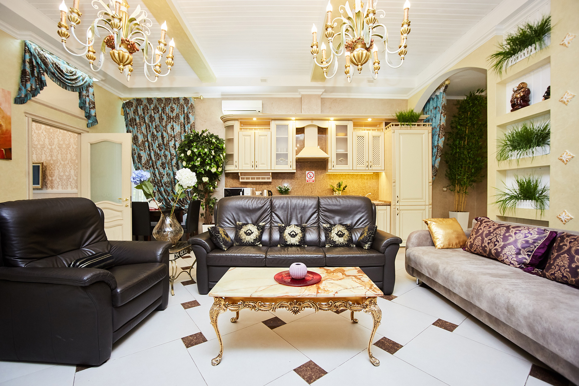 Эксклюзивные просторные апартаменты с настоящим профессиональным дизайнерским интерьером в королевском стиле. Арки, художественная роспись, использование мозаичных элементов в санузле, мраморные поверхности, дорогая мебель, красивые люстры и светильники, картины, красивые шторы, современная бытовая техника, ЖК телевизоры, стильная, полностью оборудованная кухня, создают атмосферу роскоши и комфорта.