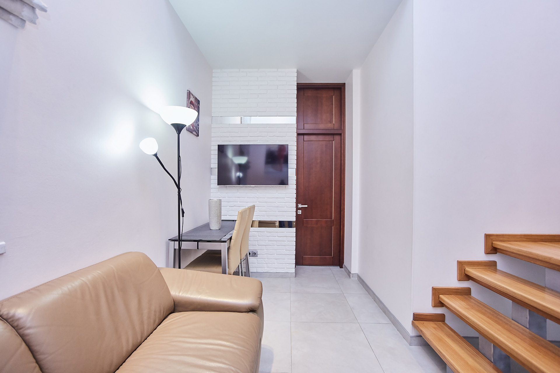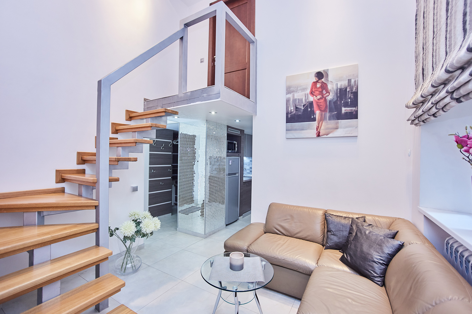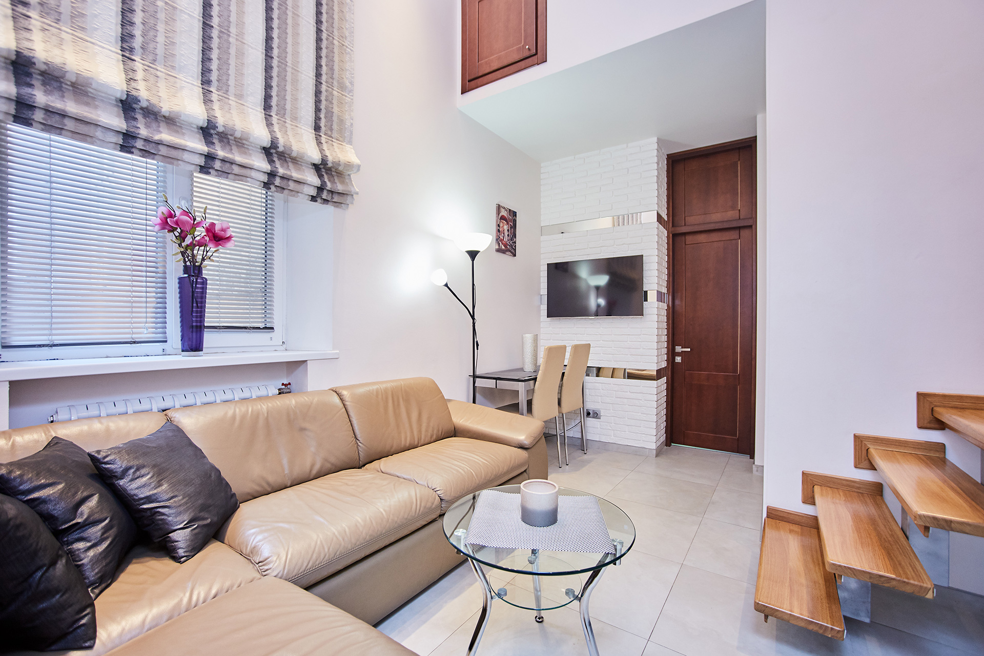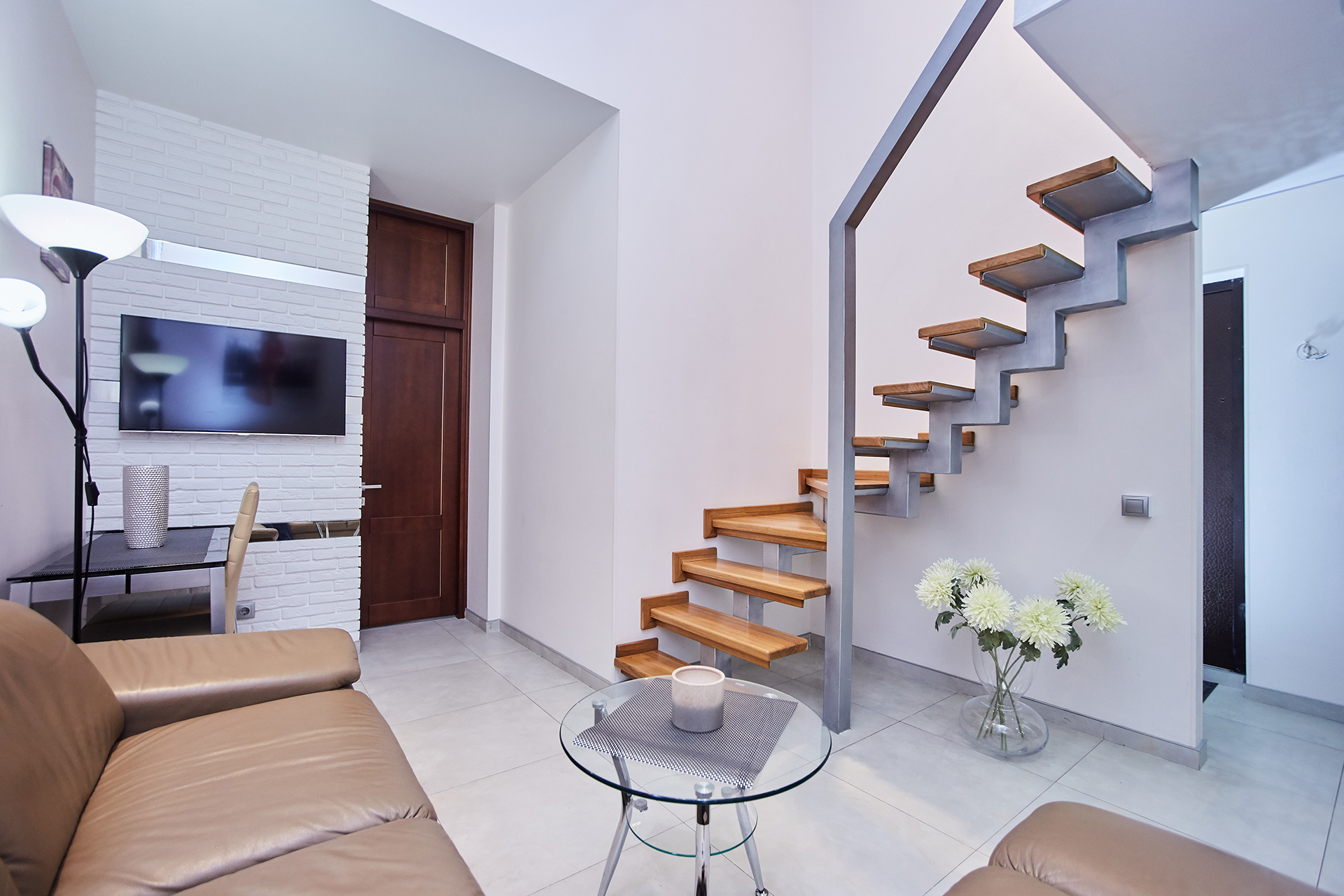 Современные двухэтажные просторные апартаменты с неповторимым, уникальным стилем — образец современного дизайна. На двух этажах апартаментов разместились: две спальни с большими двуспальными кроватями и ЖК телевизорами, кухня, оборудованная полным набором необходимой бытовой техники и посуды, в гостиной удобный большой кожаный диван, который при необходимости можно разложить в двуспальное место, ЖК телевизор, две ванных комнаты, одна из которых с ванной-джакузи для двоих и во второй — душевая кабина. В интерьере апартаментов использовались мягкие и спокойные тона.