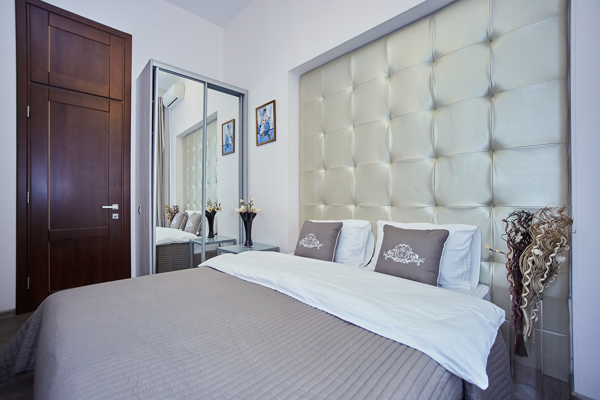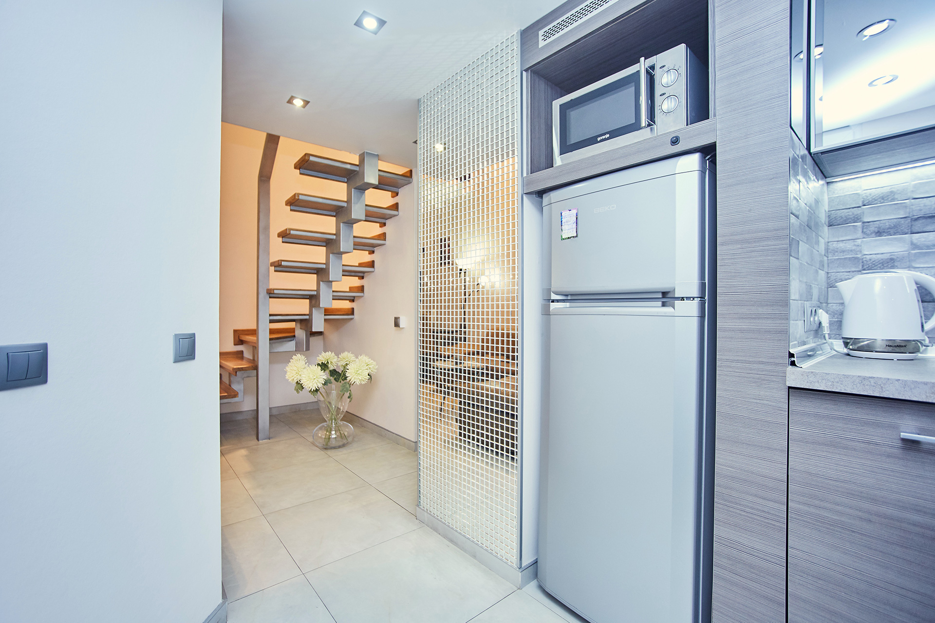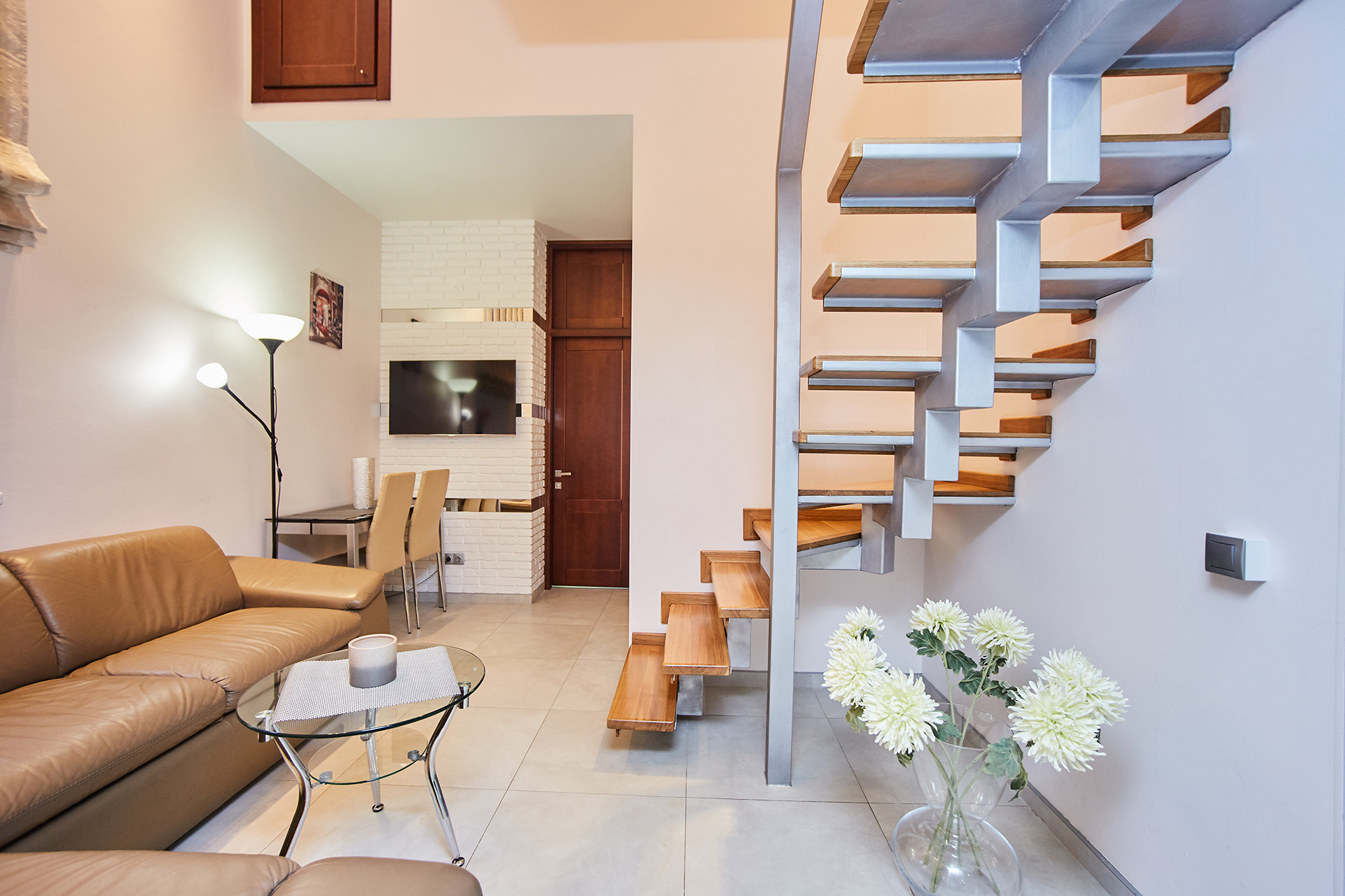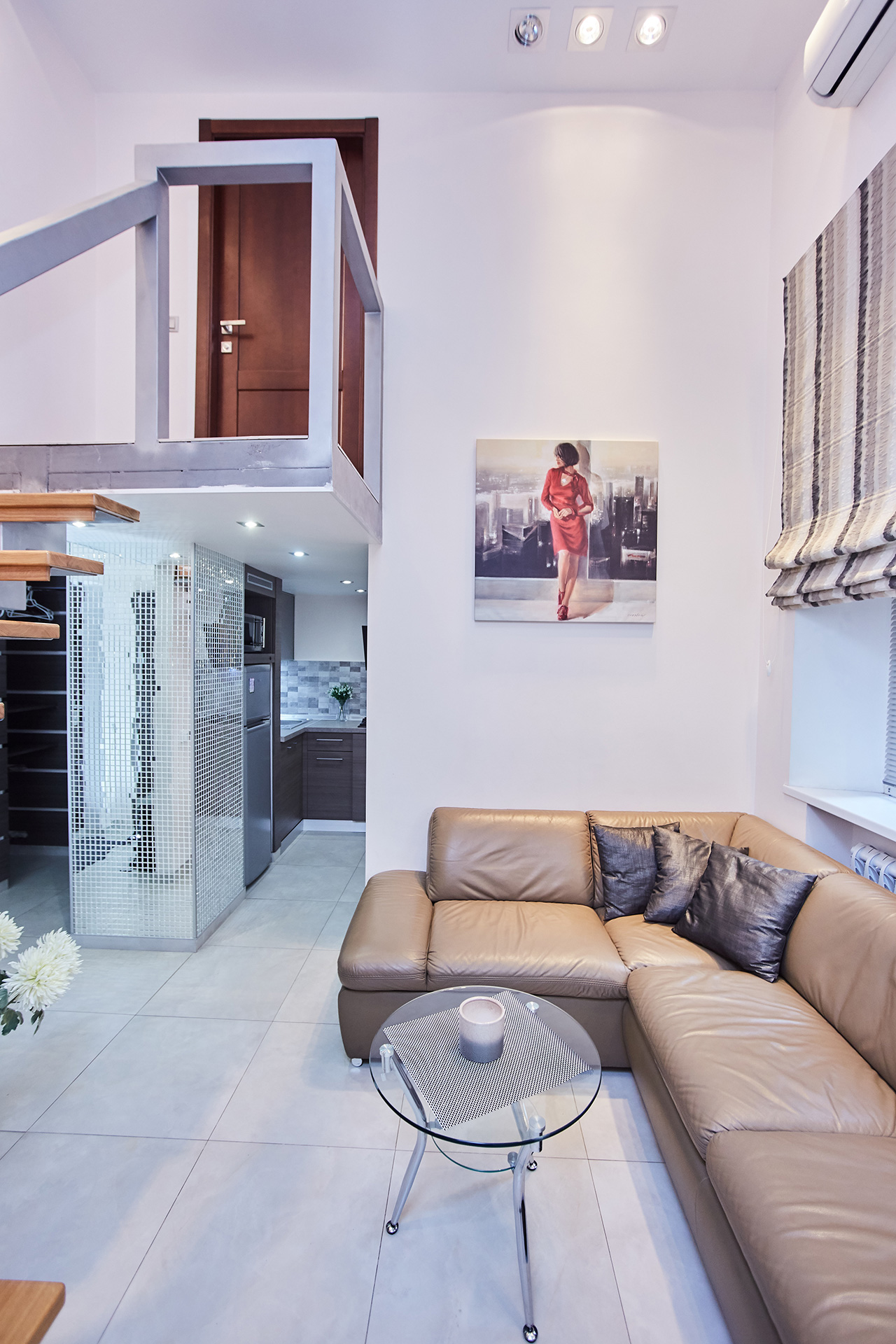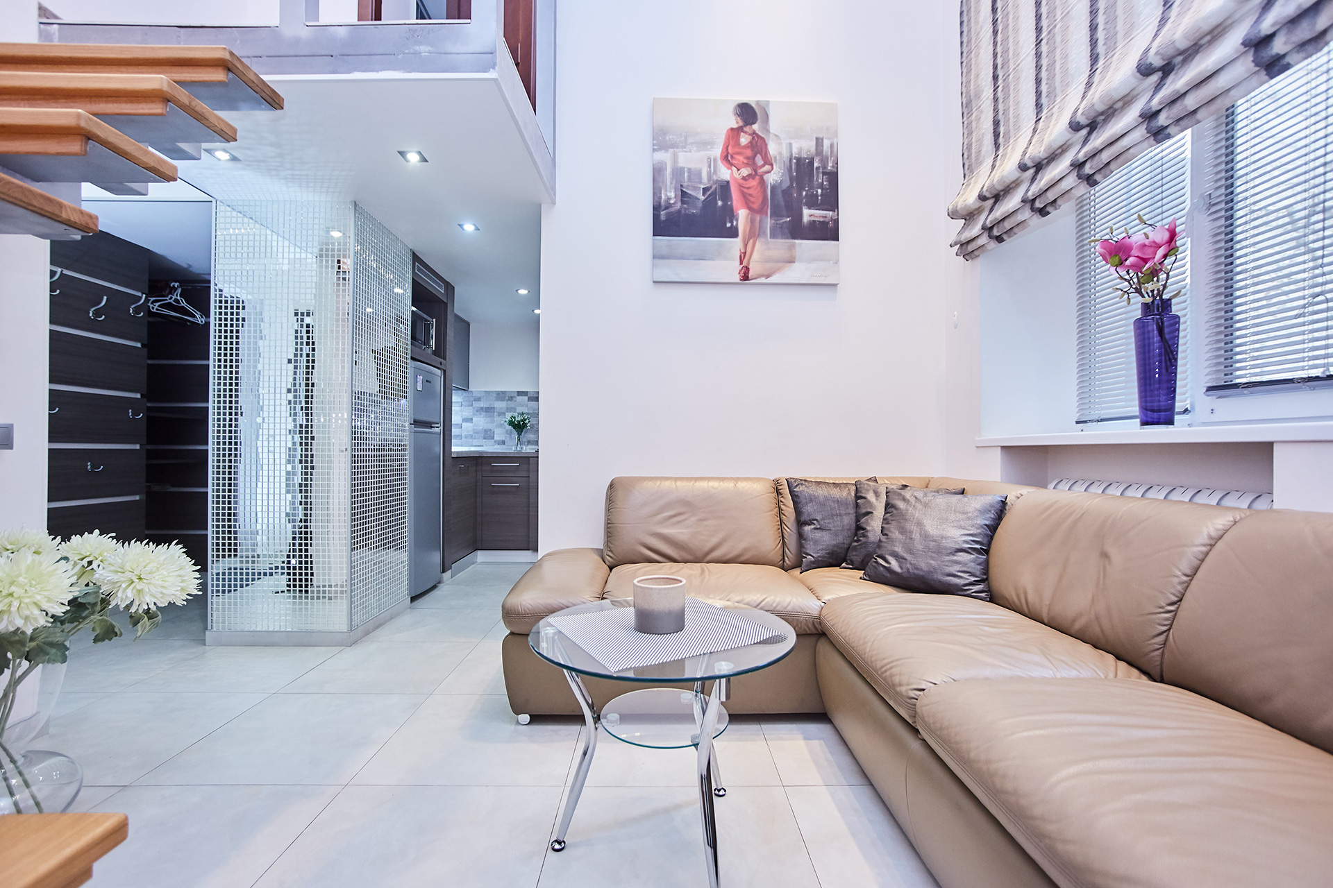 Современные двухэтажные просторные апартаменты с неповторимым, уникальным стилем — образец современного дизайна. На двух этажах апартаментов разместились: две спальни с большими двуспальными кроватями и ЖК телевизорами, кухня, оборудованная полным набором необходимой бытовой техники и посуды, в гостиной удобный большой кожаный диван, который при необходимости можно разложить в двуспальное место, ЖК телевизор, две ванных комнаты, одна из которых с ванной-джакузи для двоих и во второй — душевая кабина. В интерьере апартаментов использовались мягкие и спокойные тона.