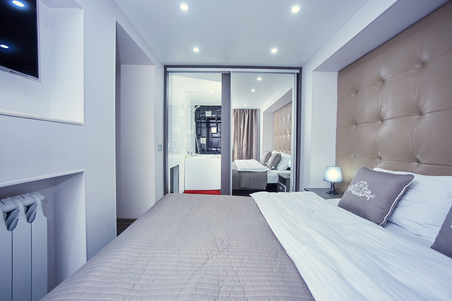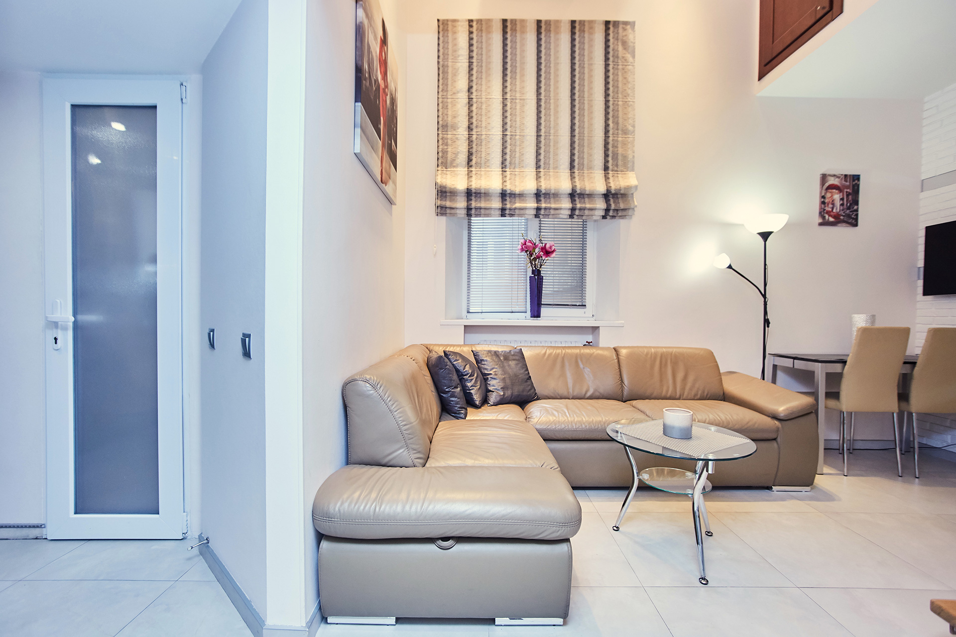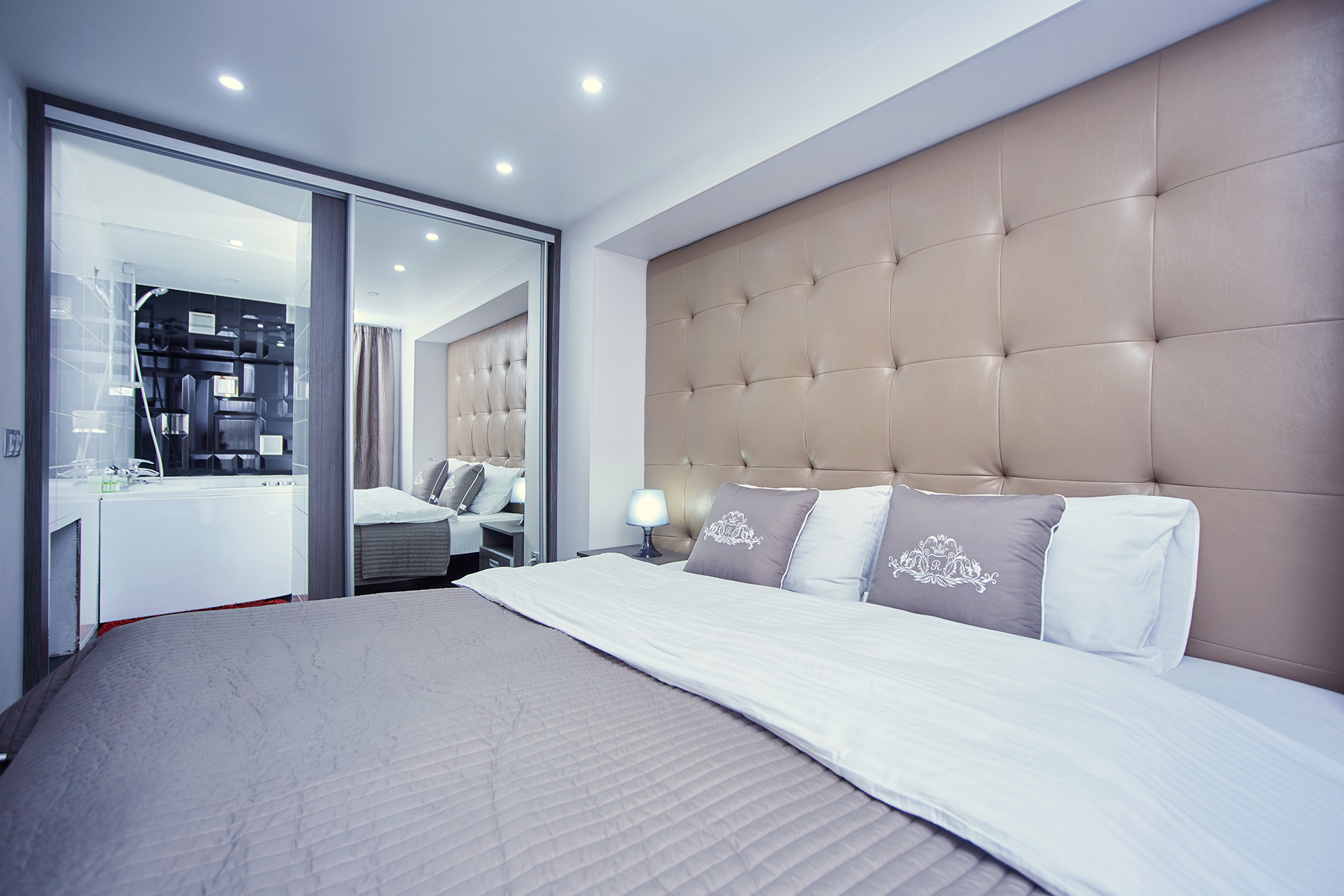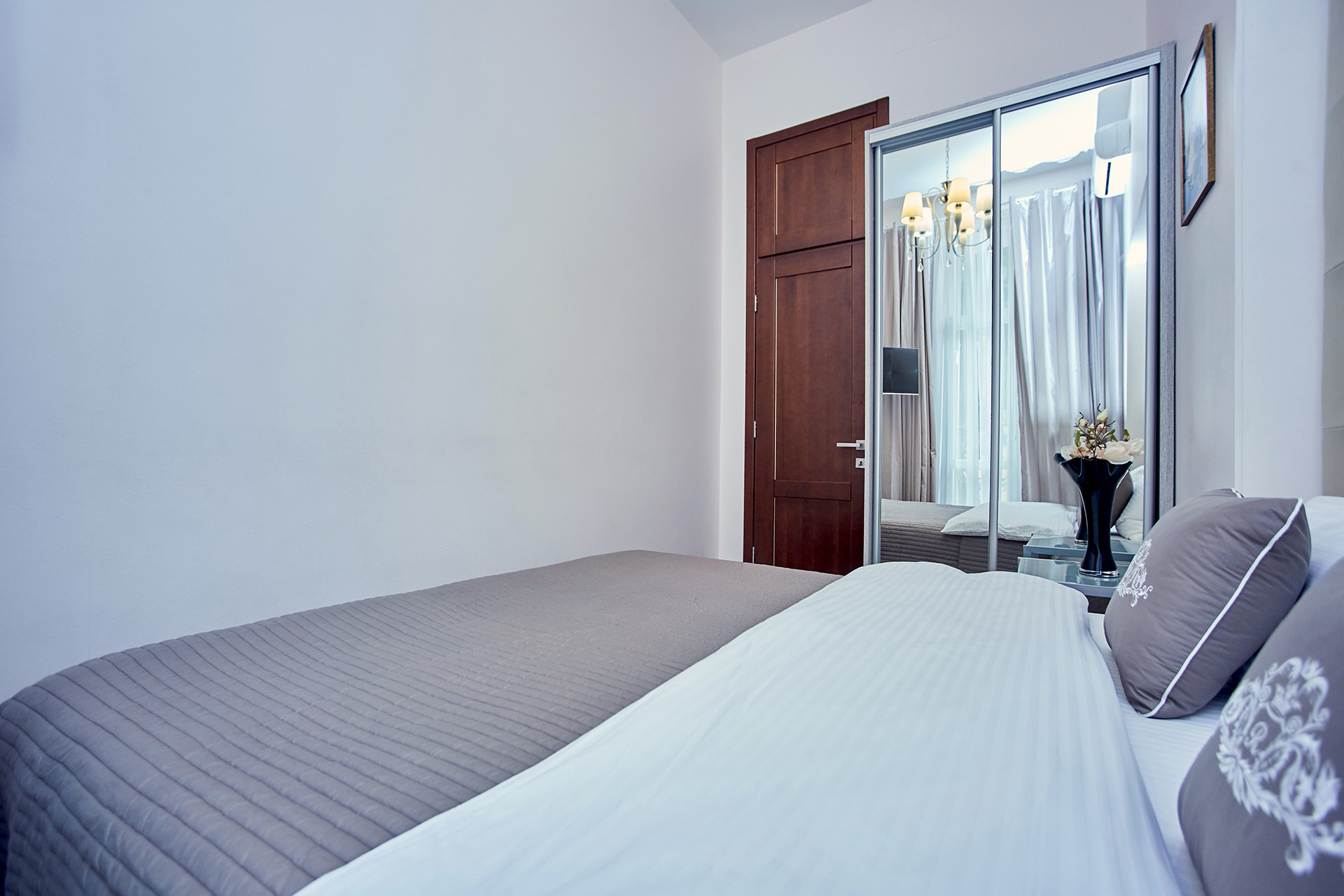 Современные двухэтажные просторные апартаменты с неповторимым, уникальным стилем — образец современного дизайна. На двух этажах апартаментов разместились: две спальни с большими двуспальными кроватями и ЖК телевизорами, кухня, оборудованная полным набором необходимой бытовой техники и посуды, в гостиной удобный большой кожаный диван, который при необходимости можно разложить в двуспальное место, ЖК телевизор, две ванных комнаты, одна из которых с ванной-джакузи для двоих и во второй — душевая кабина. В интерьере апартаментов использовались мягкие и спокойные тона.