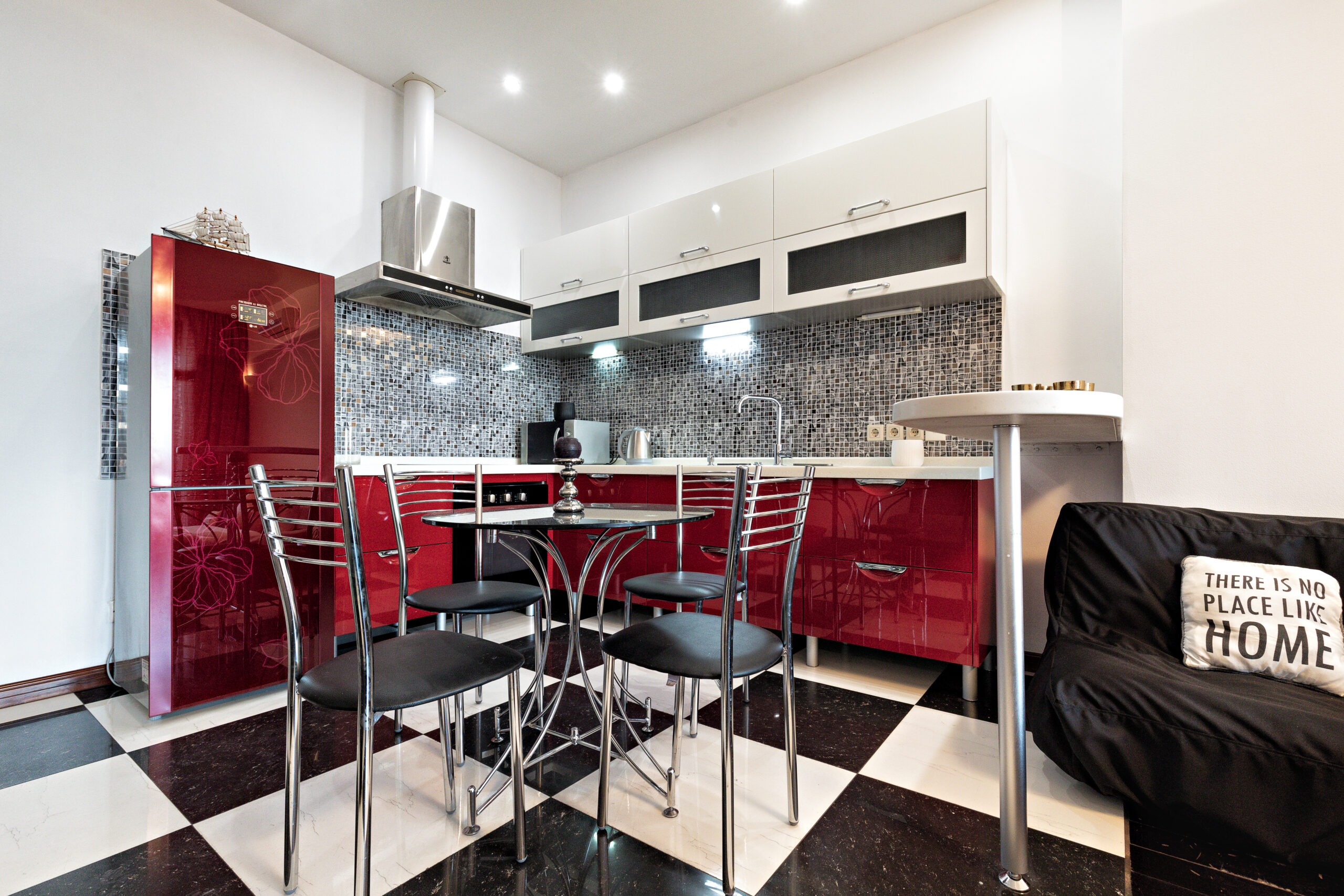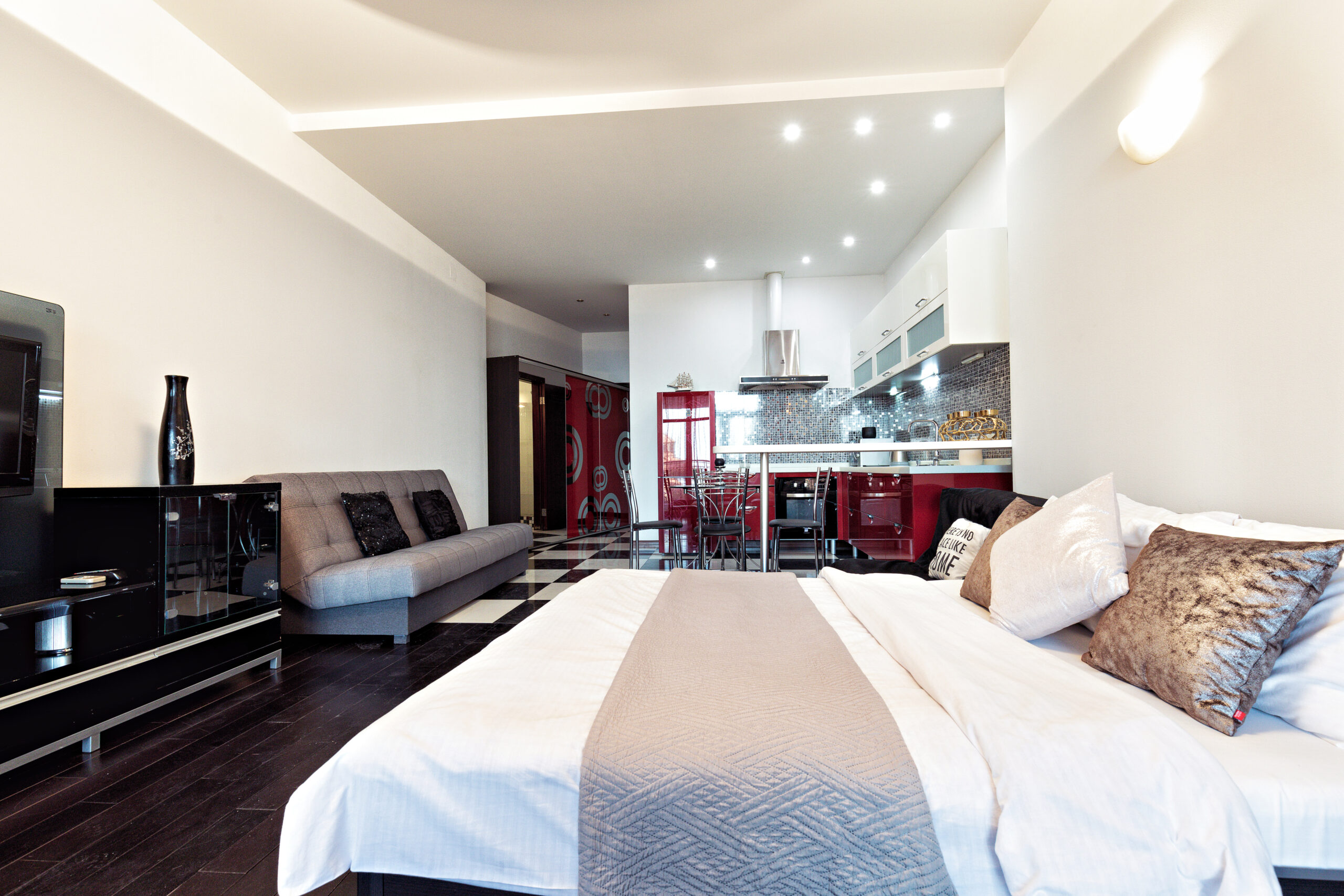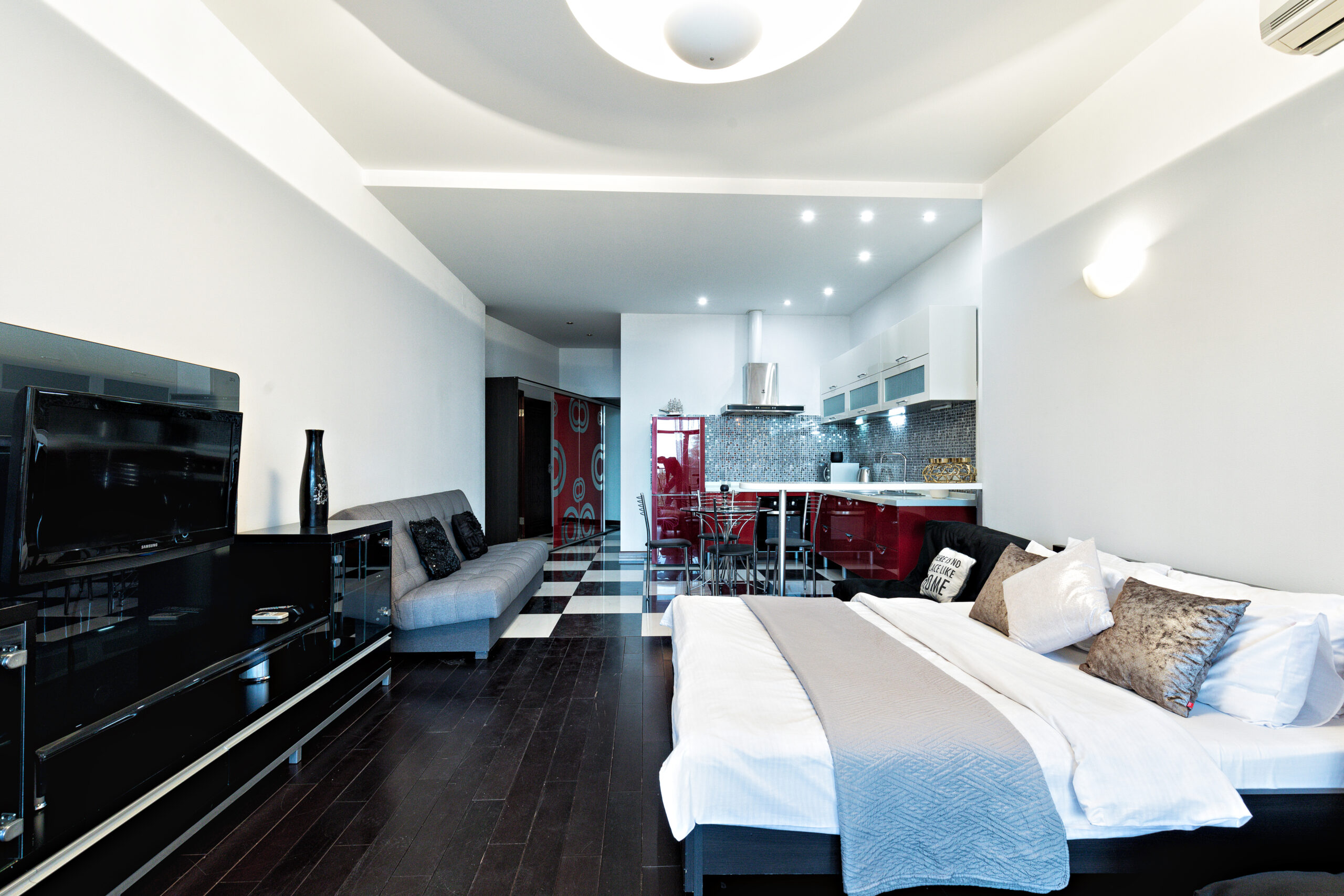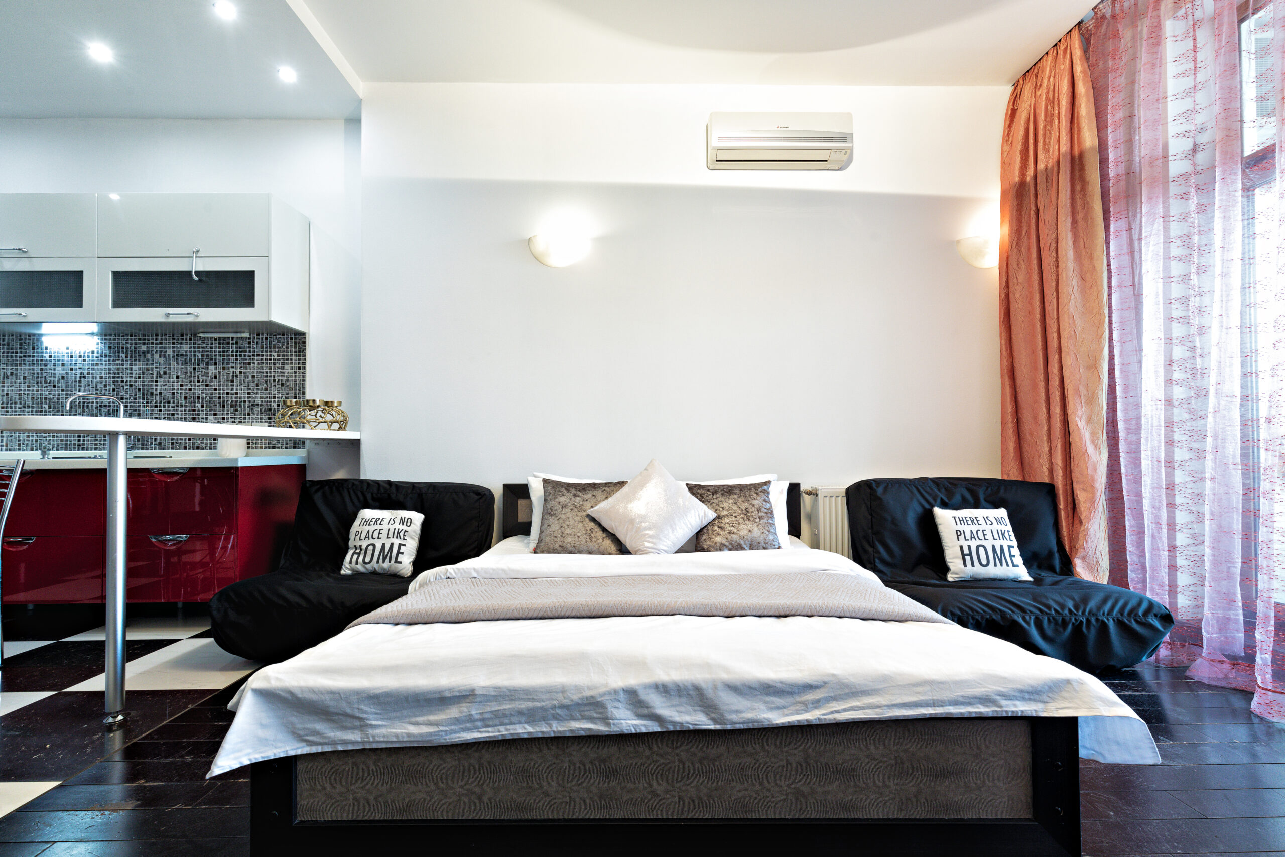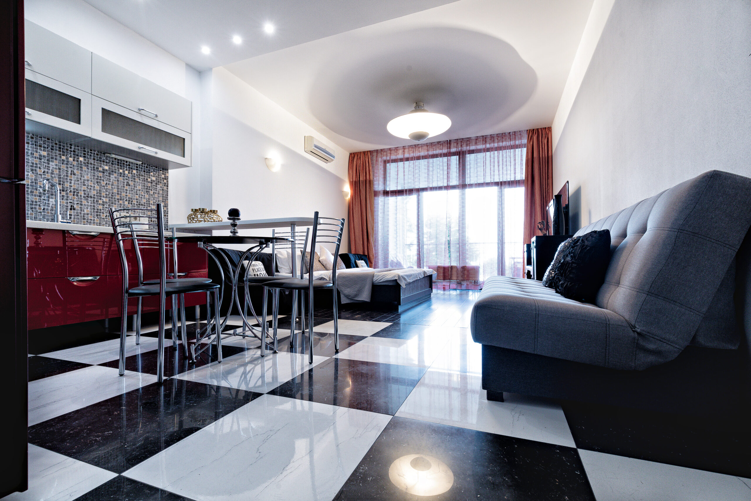 Стильные современные апартаменты студийной планировки с запоминающимся дизайном, с использованием качественных материалов. Пространство апартаментов разделено на спальную и гостевую зоны. В спальной зоне двуспальная кровать, в гостевой — большая зона-релакс, в которой размещены диван, журнальный столик, ЖК ТВ 40’’. И конечно же кухня с обеденной зоной со столом и стульями. В ванной комнате душевая кабина. Просторная терраса с удивительными пейзажами Одессы.