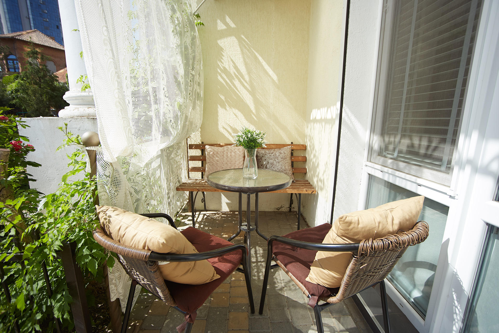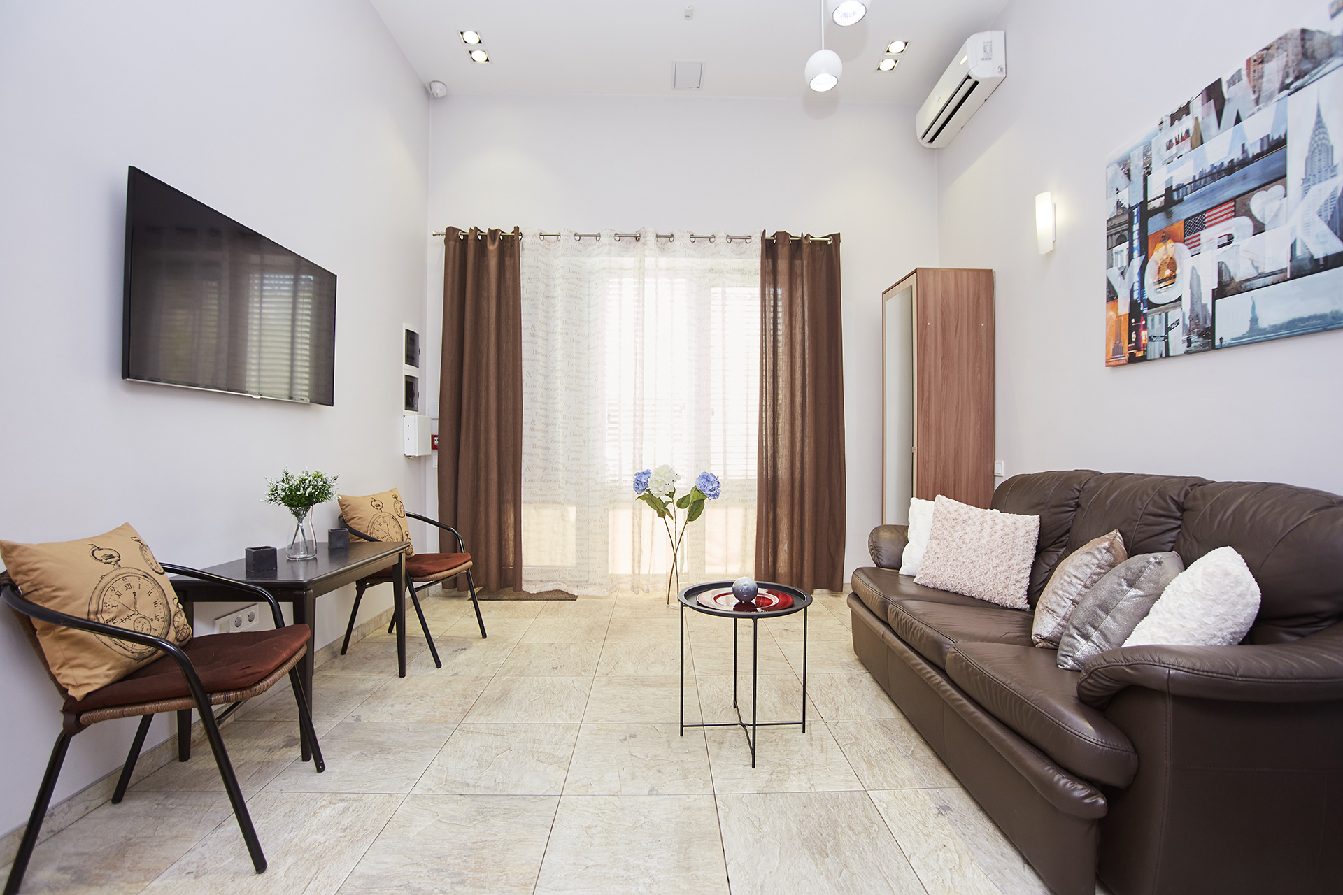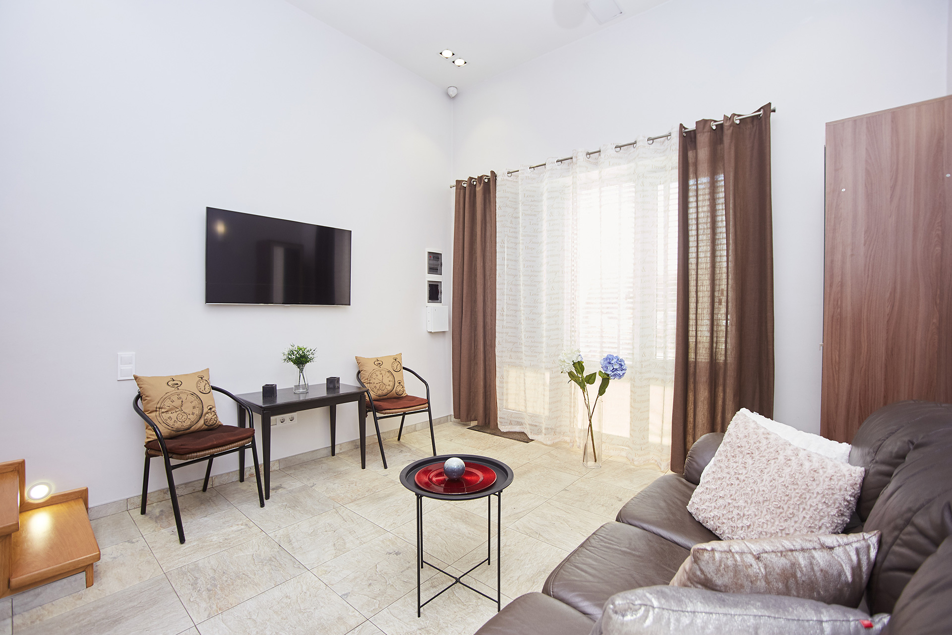 The living room has an entrance into a small terrace with outdoor furniture in the courtyard.