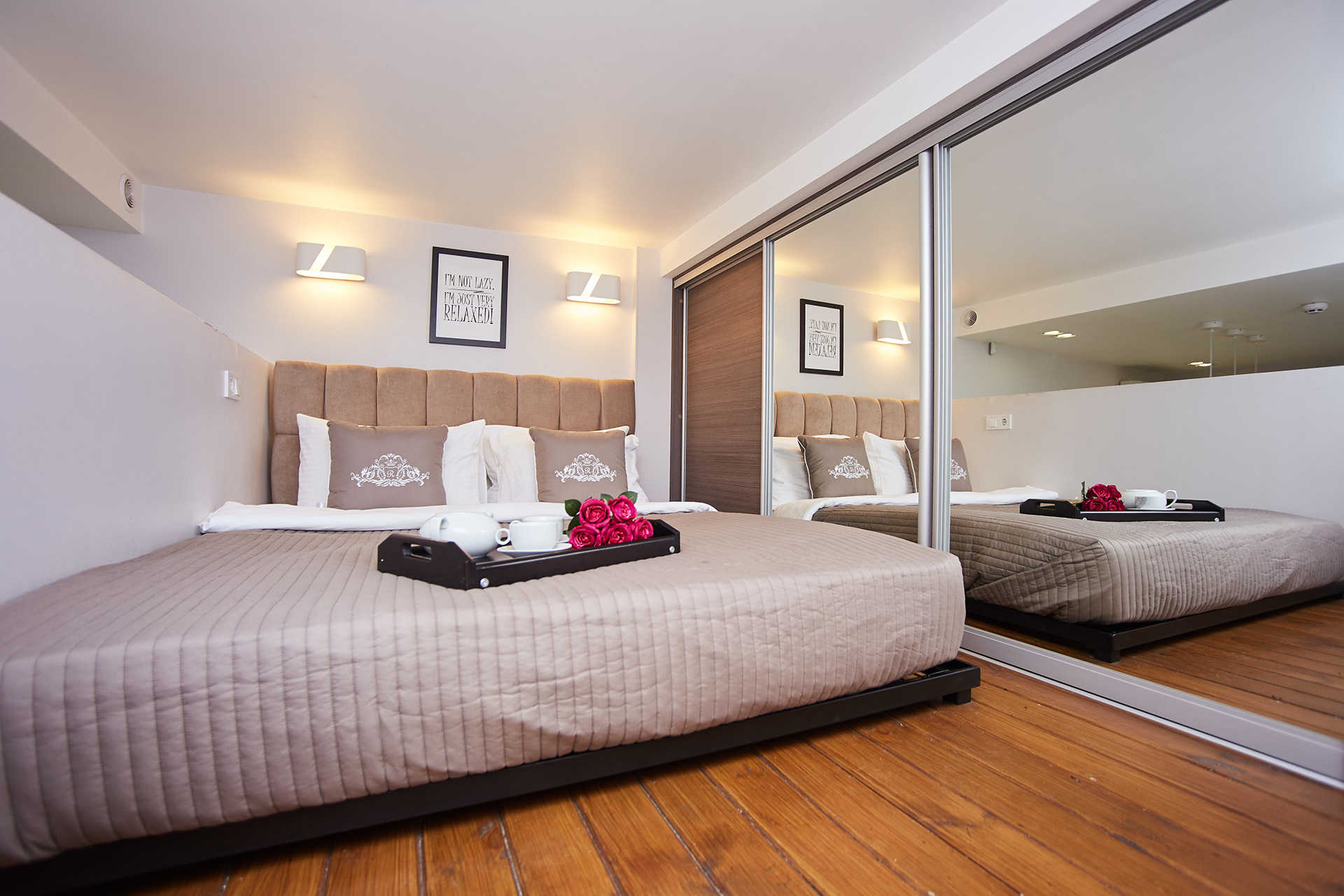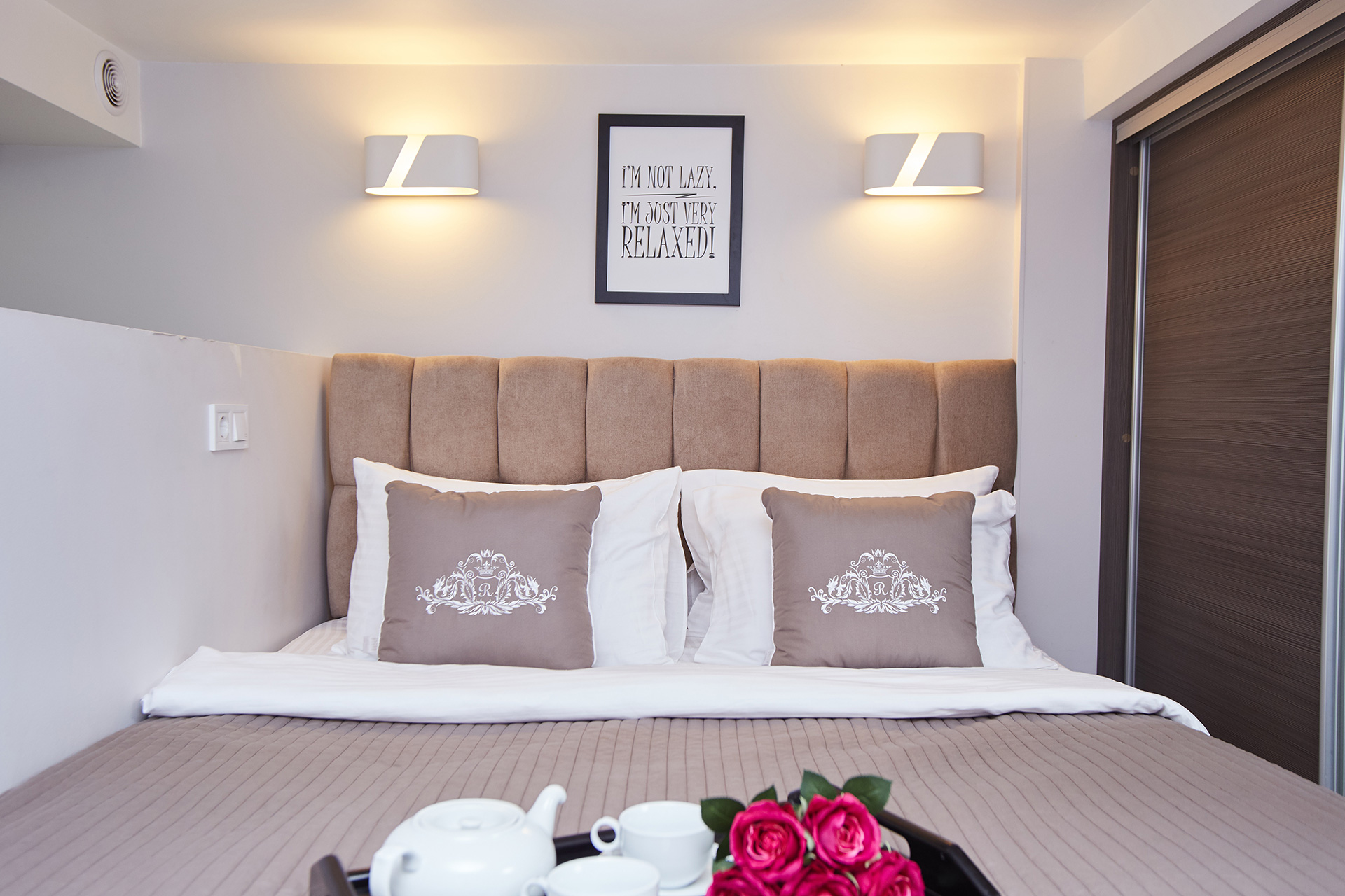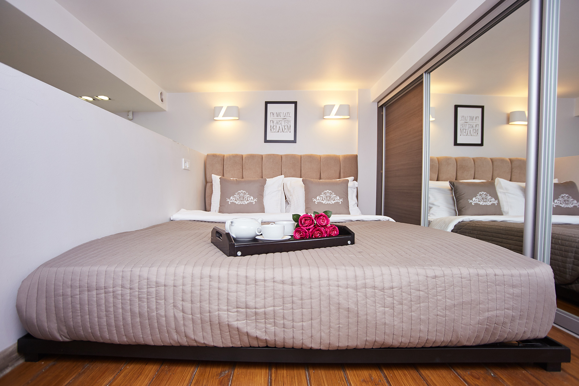 As for the bedroom, it is designed in calm light colors. We use special light to create a romantic and refined atmosphere. We have everything to make you stay here a real pleasure and provide you and your guests with a maximum space and comfort — a huge comfortable bed, a spacious sliding doors wardrobe, a large sofa easily transformed into a double bed, a coffee table, a flat-screen TV.