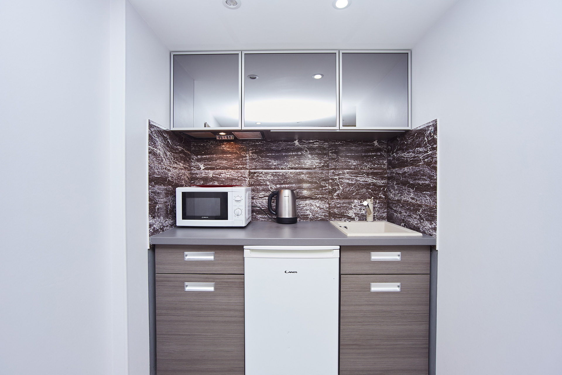 - kettle, coffee maker, coffee and tea;
