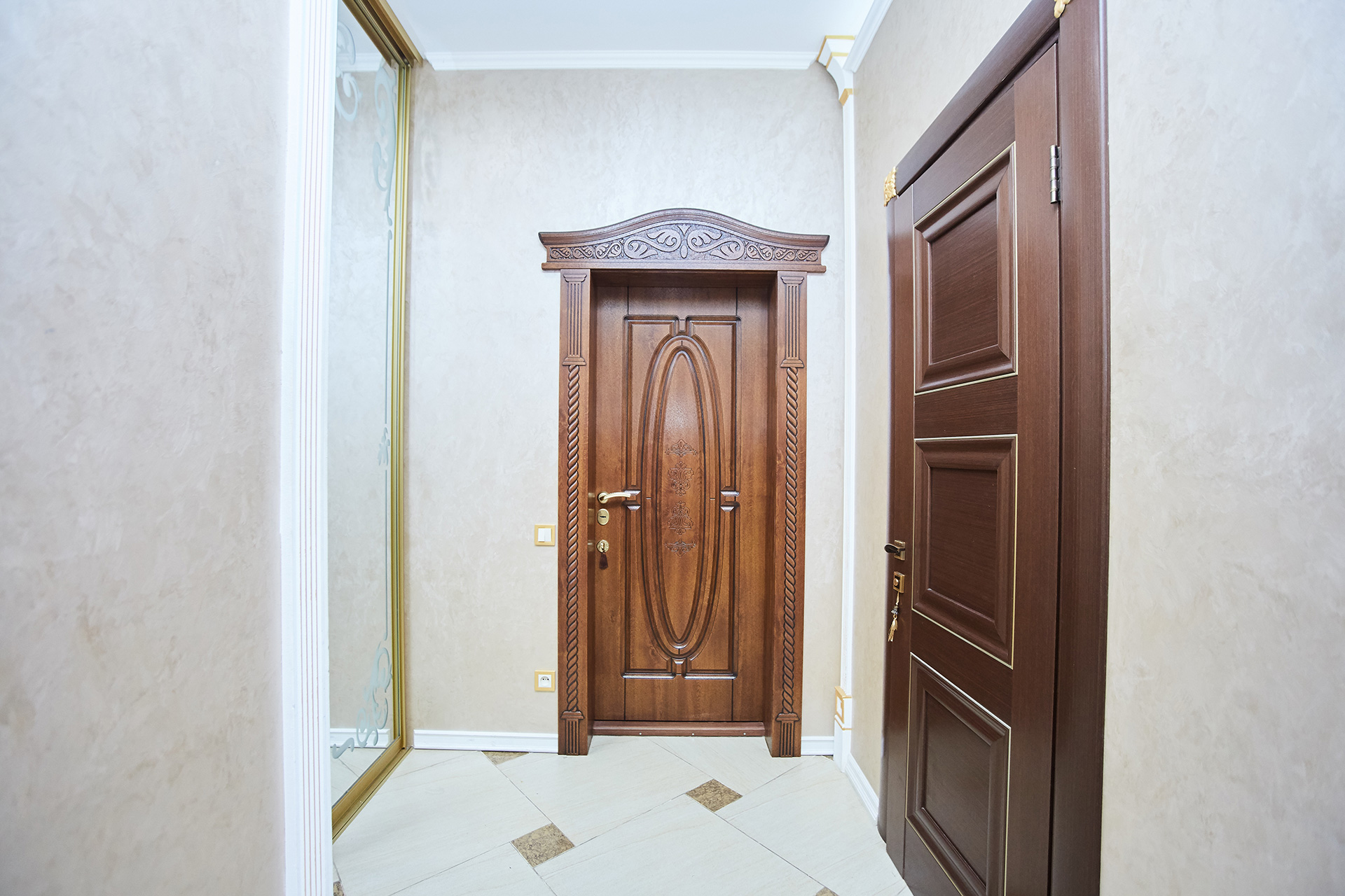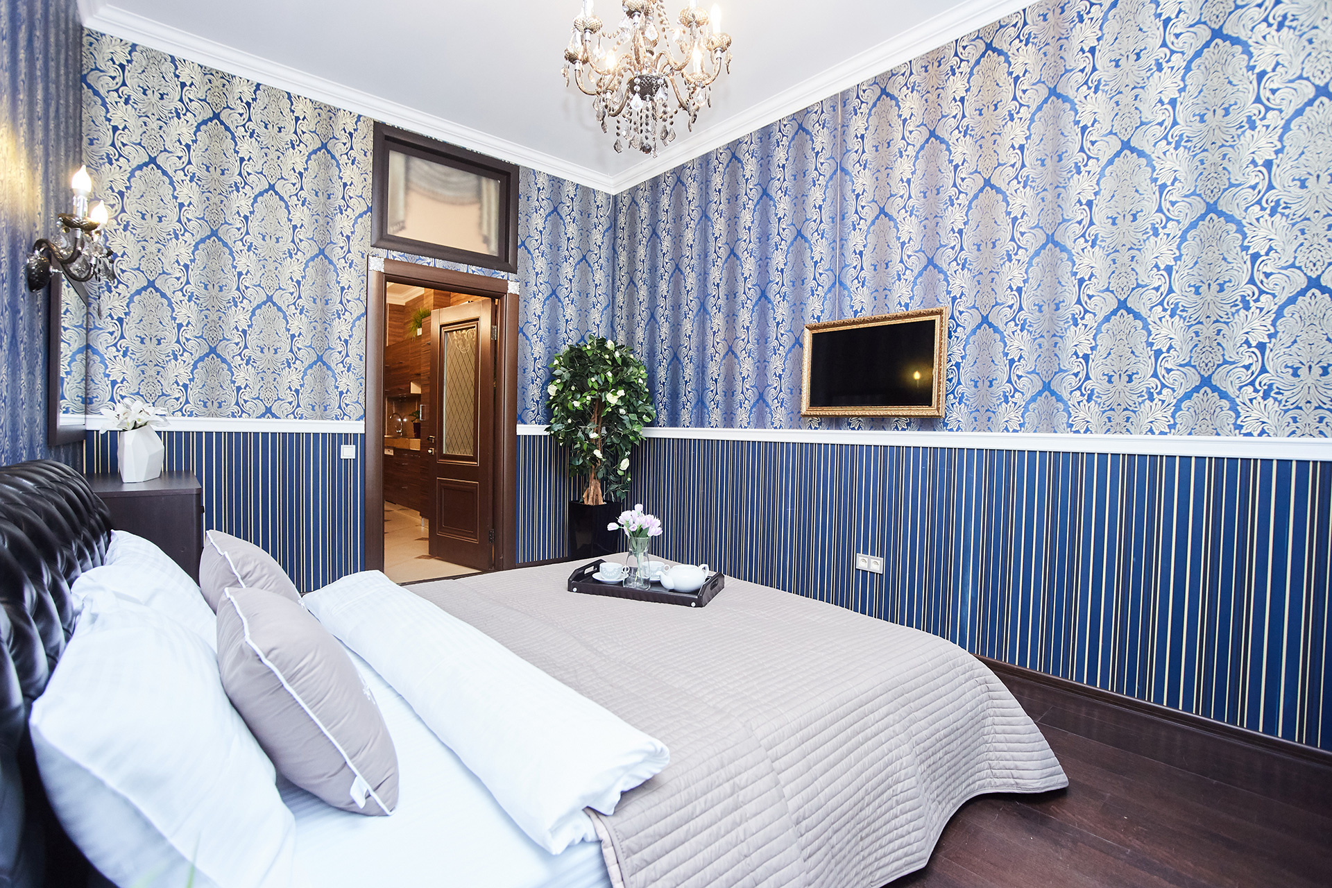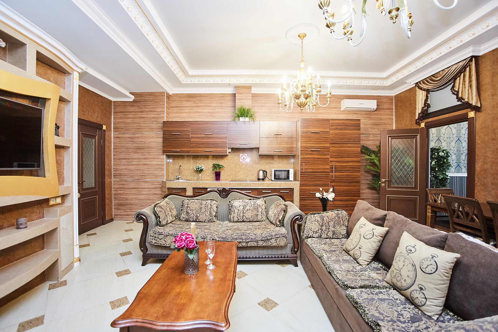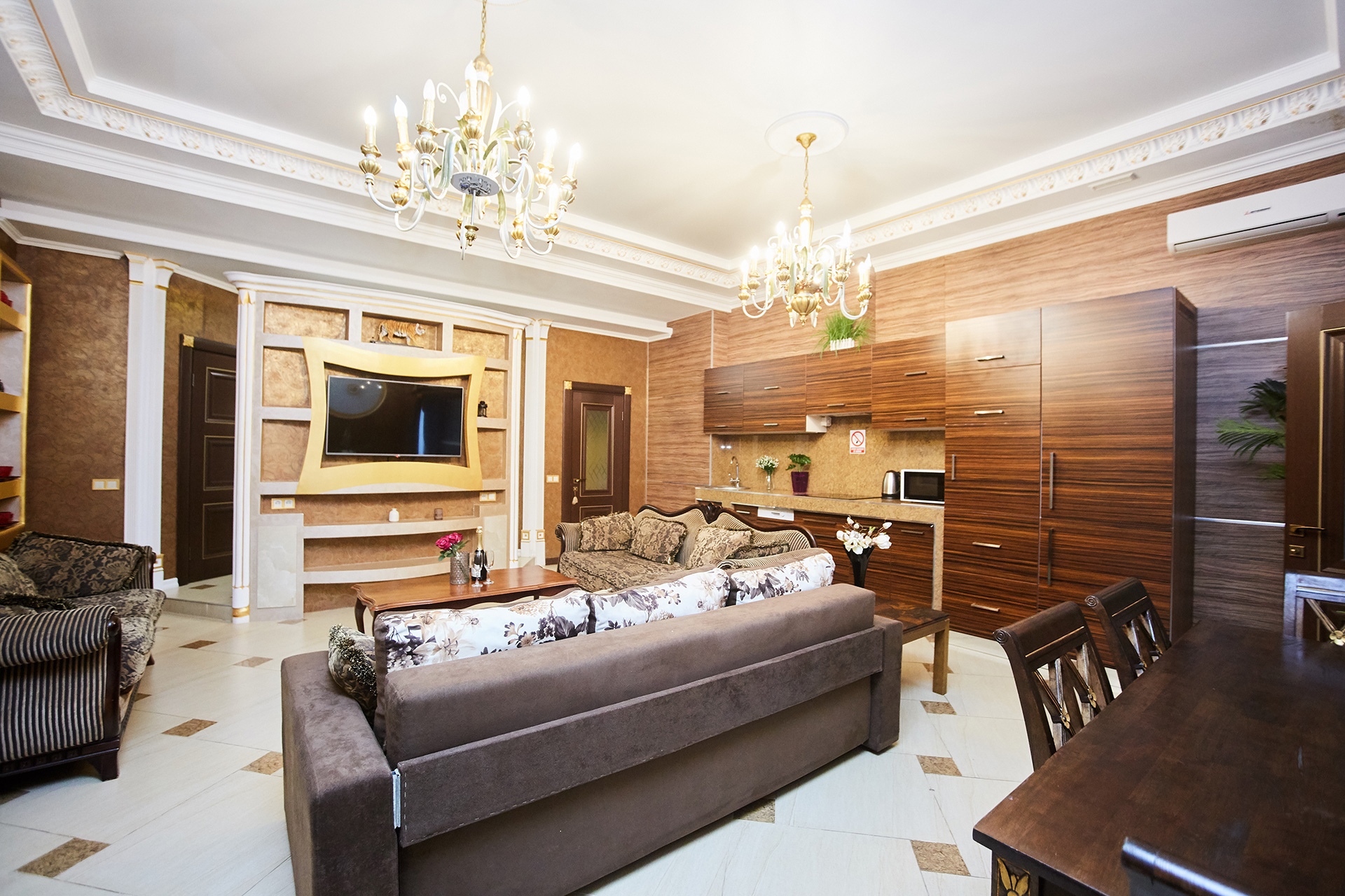 The exclusive spacious apartment is modern in interior and design in so called royal style. Arches, art paintings, mosaic elements in the bathroom, marble surfaces, expensive furniture, beautiful chandeliers and lamps, paintings, beautiful curtains, modern appliances, LCD TVs, a stylish, fully equipped kitchen create an atmosphere of luxury and comfort.