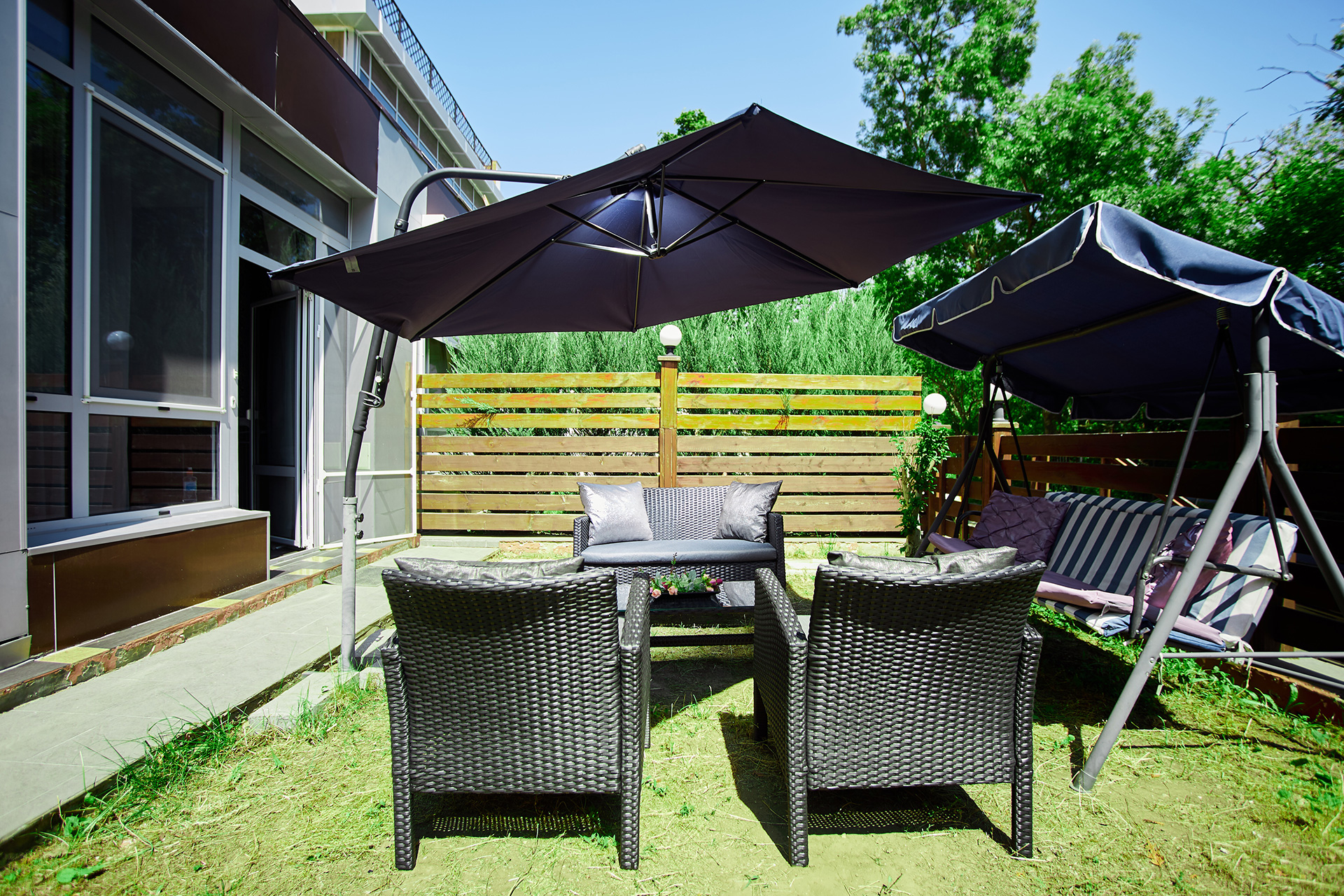 Two bedrooms open into the terrace with outdoor furniture.