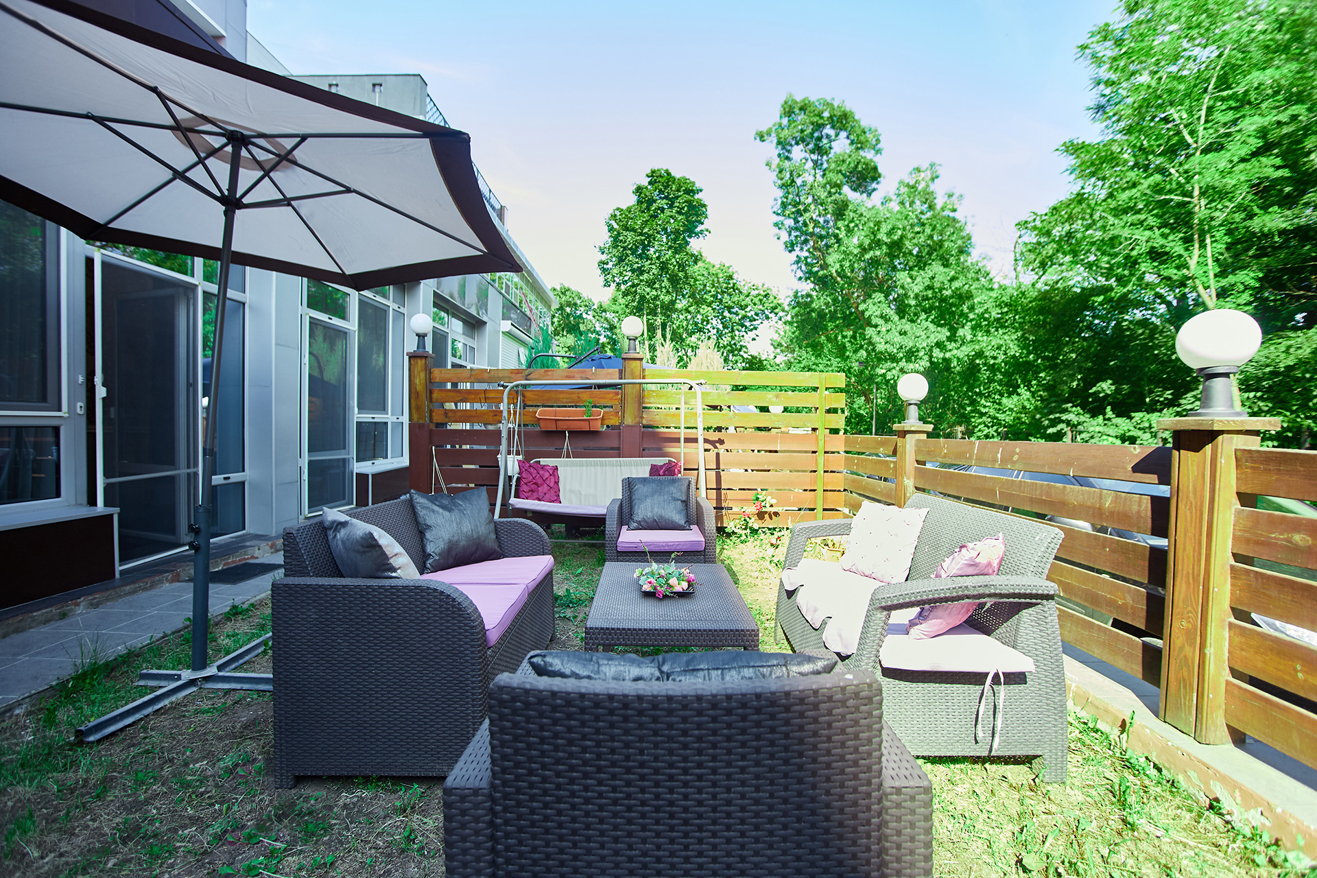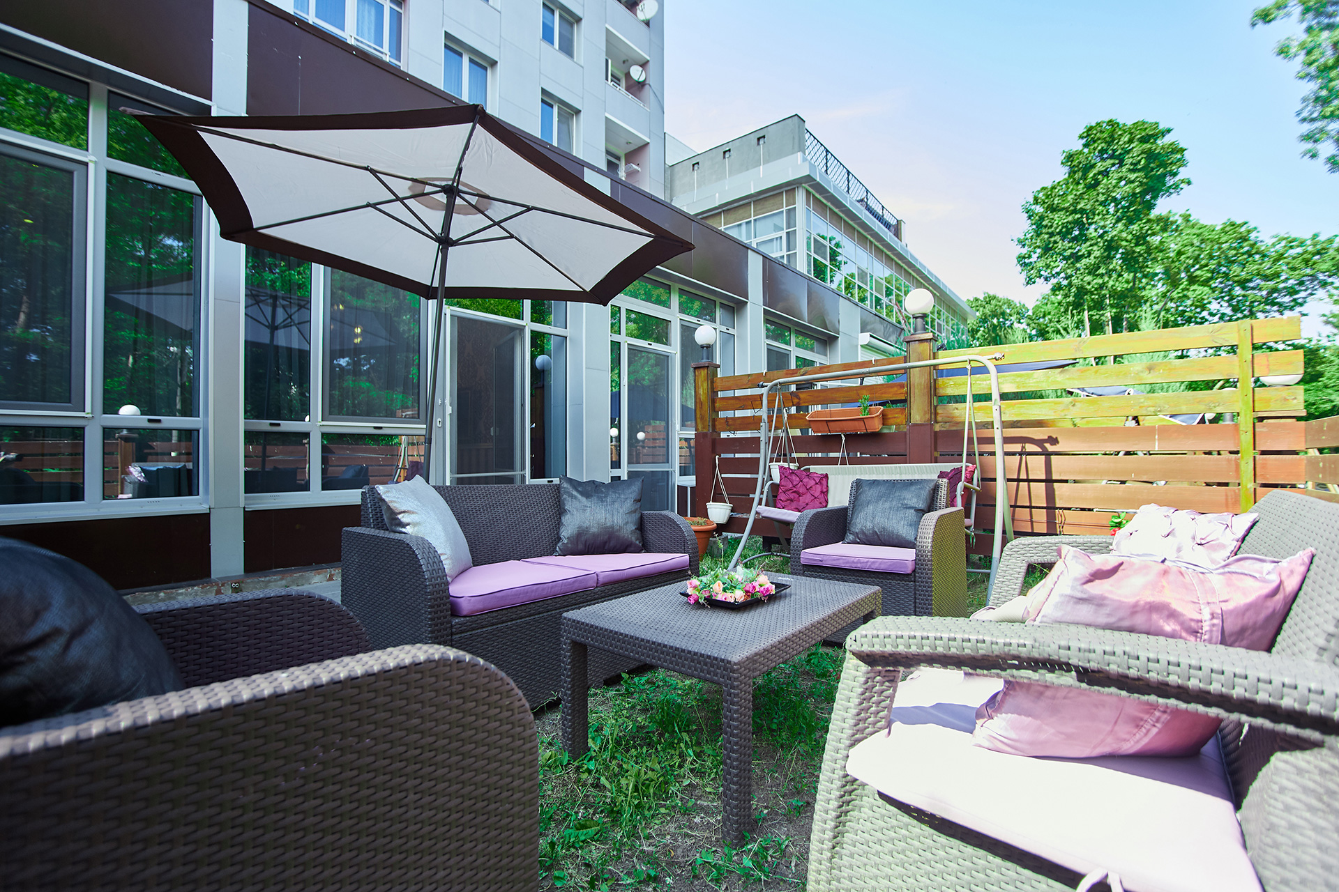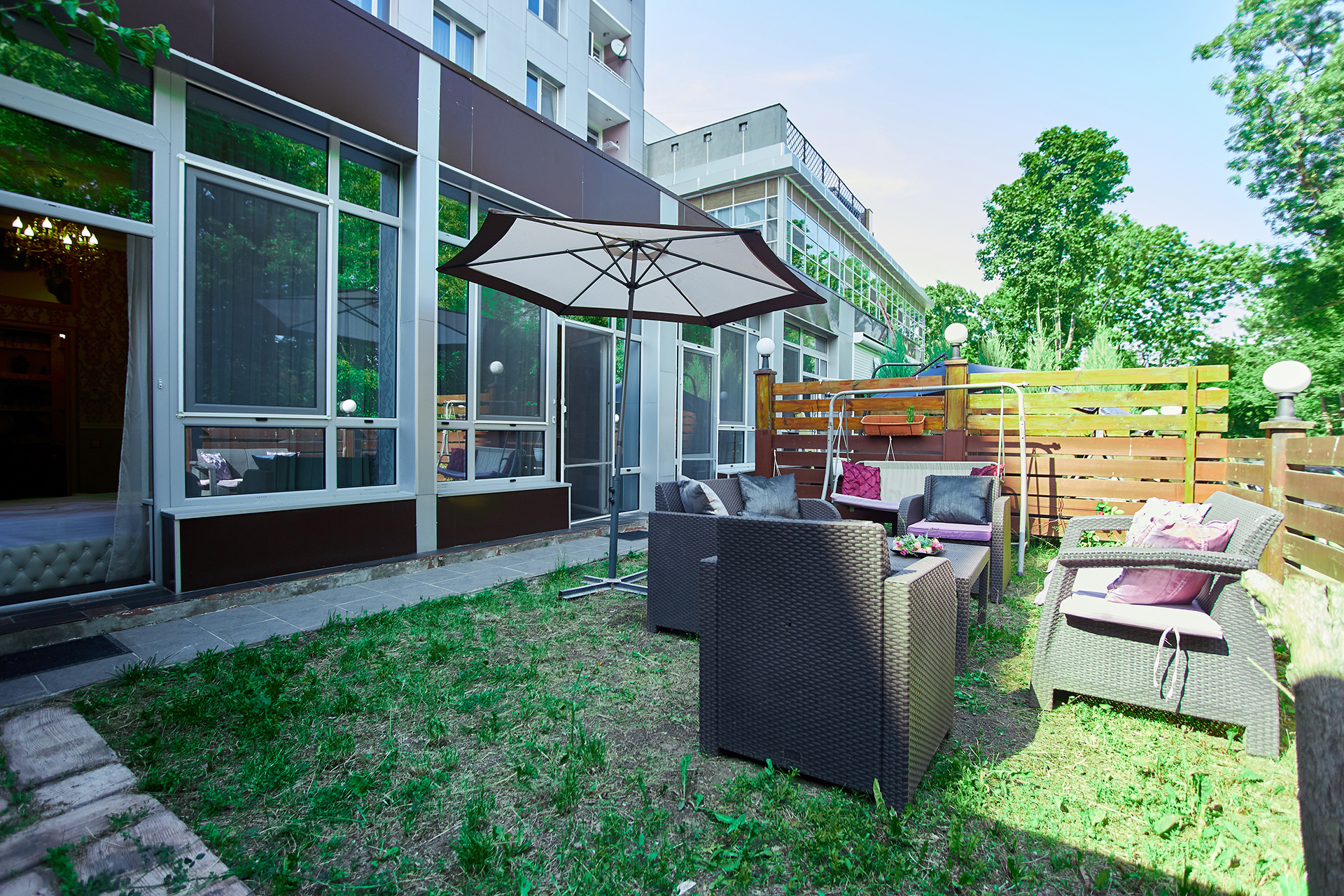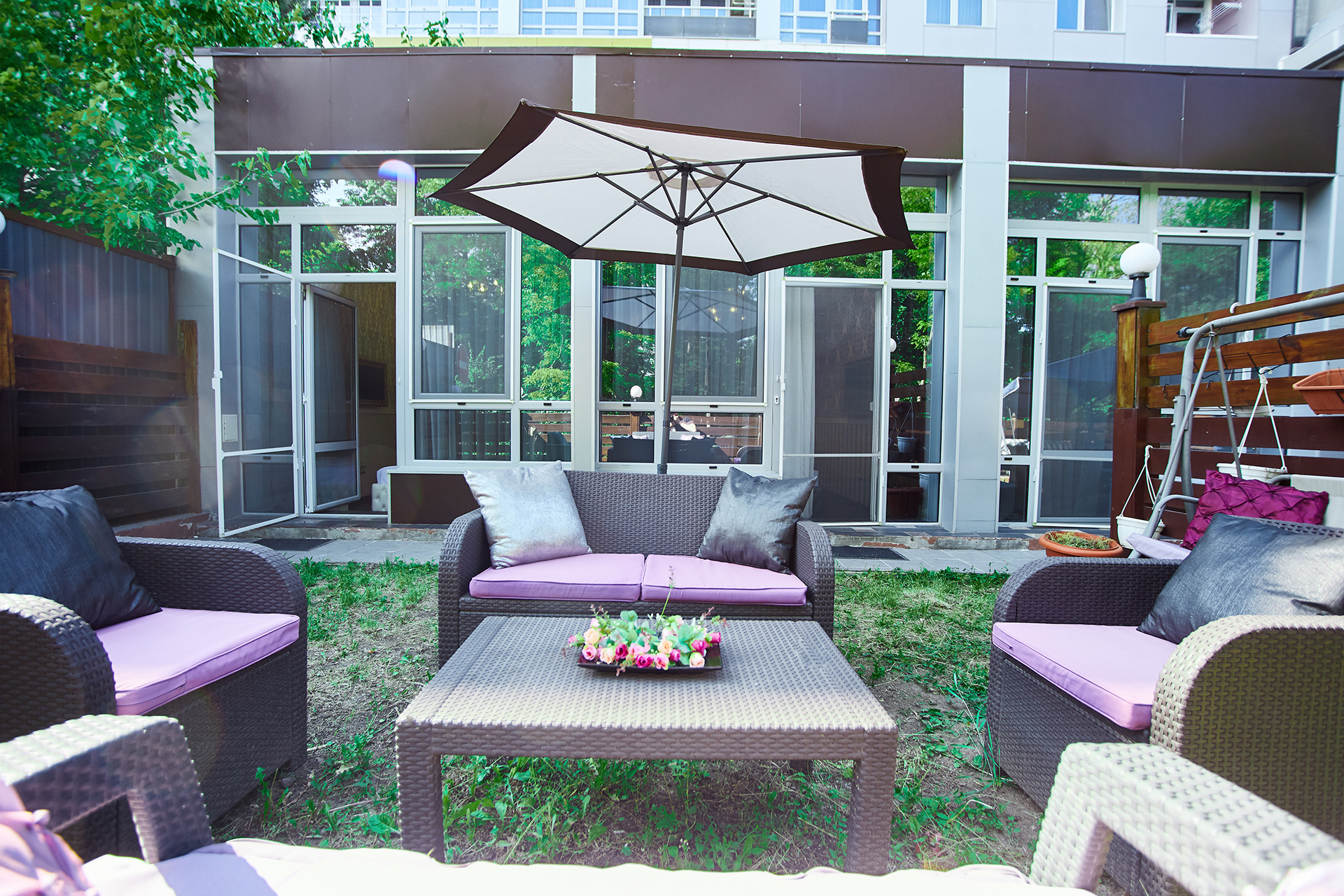 Two bedrooms open into the terrace with outdoor furniture.