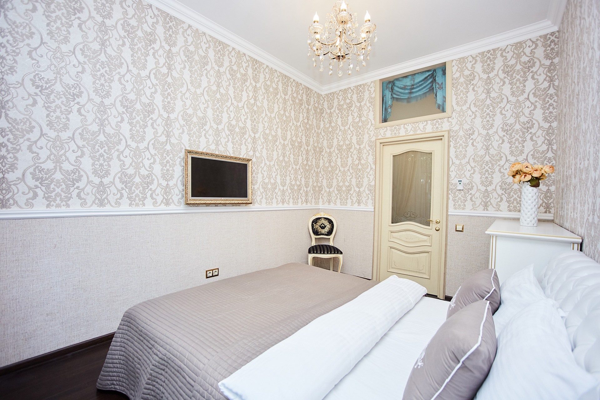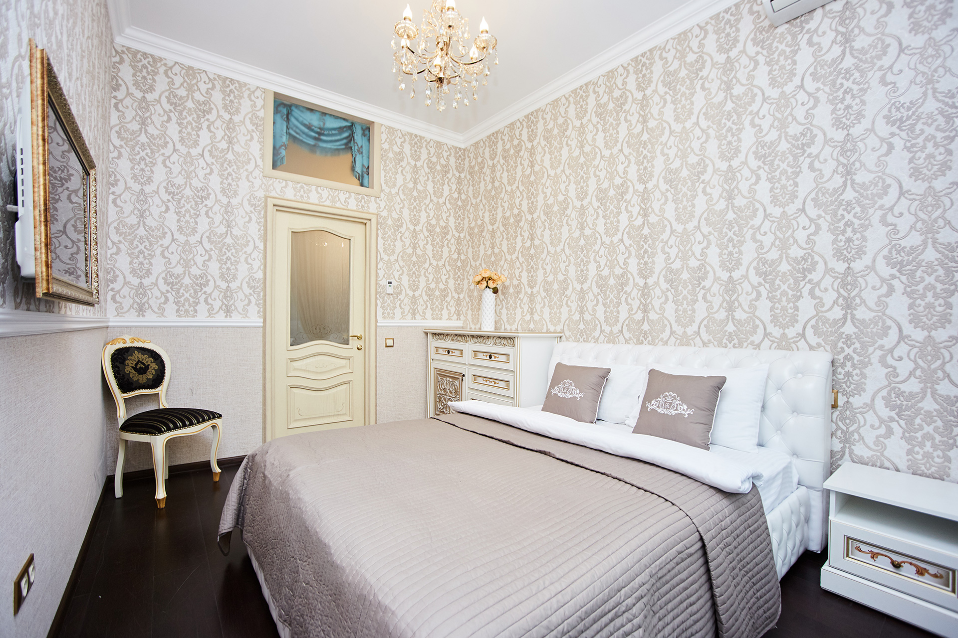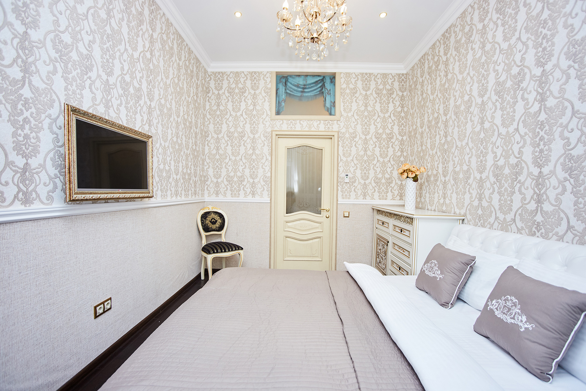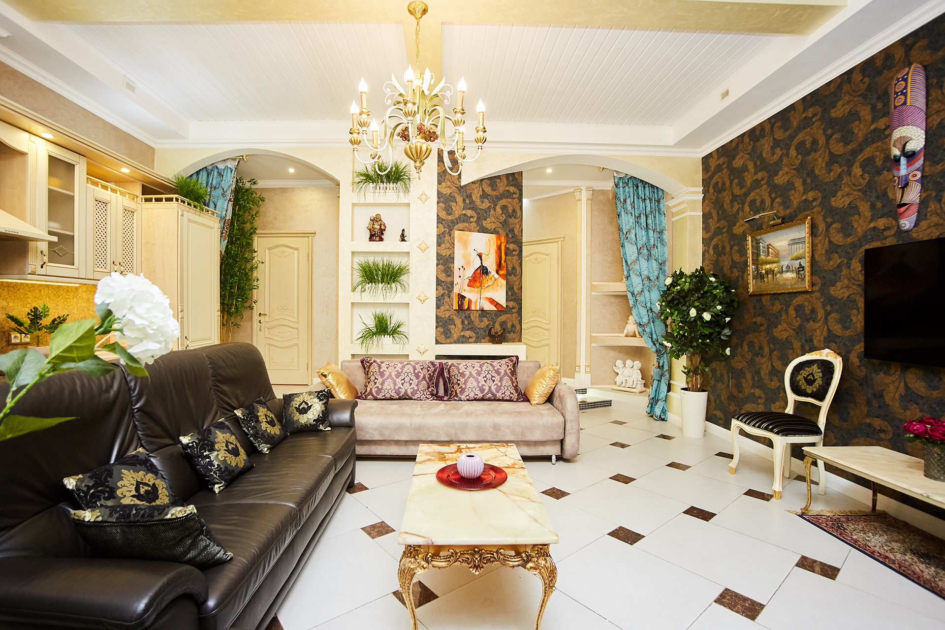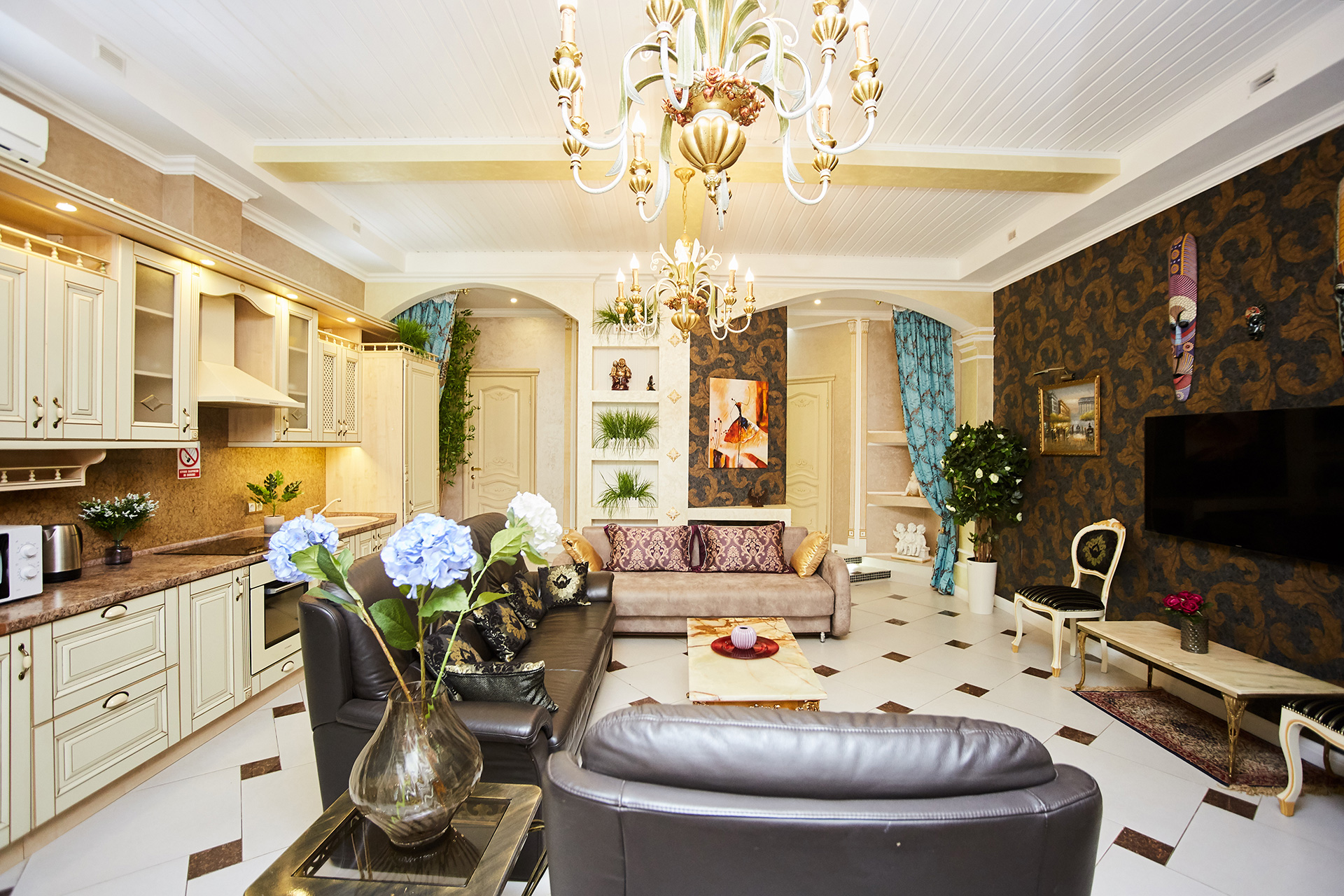 The exclusive spacious apartment is modern in interior and design in so called royal style. Arches, art paintings, mosaic elements in the bathroom, marble surfaces, expensive furniture, beautiful chandeliers and lamps, paintings, beautiful curtains, modern appliances, LCD TVs, a stylish, fully equipped kitchen create an atmosphere of luxury and comfort.