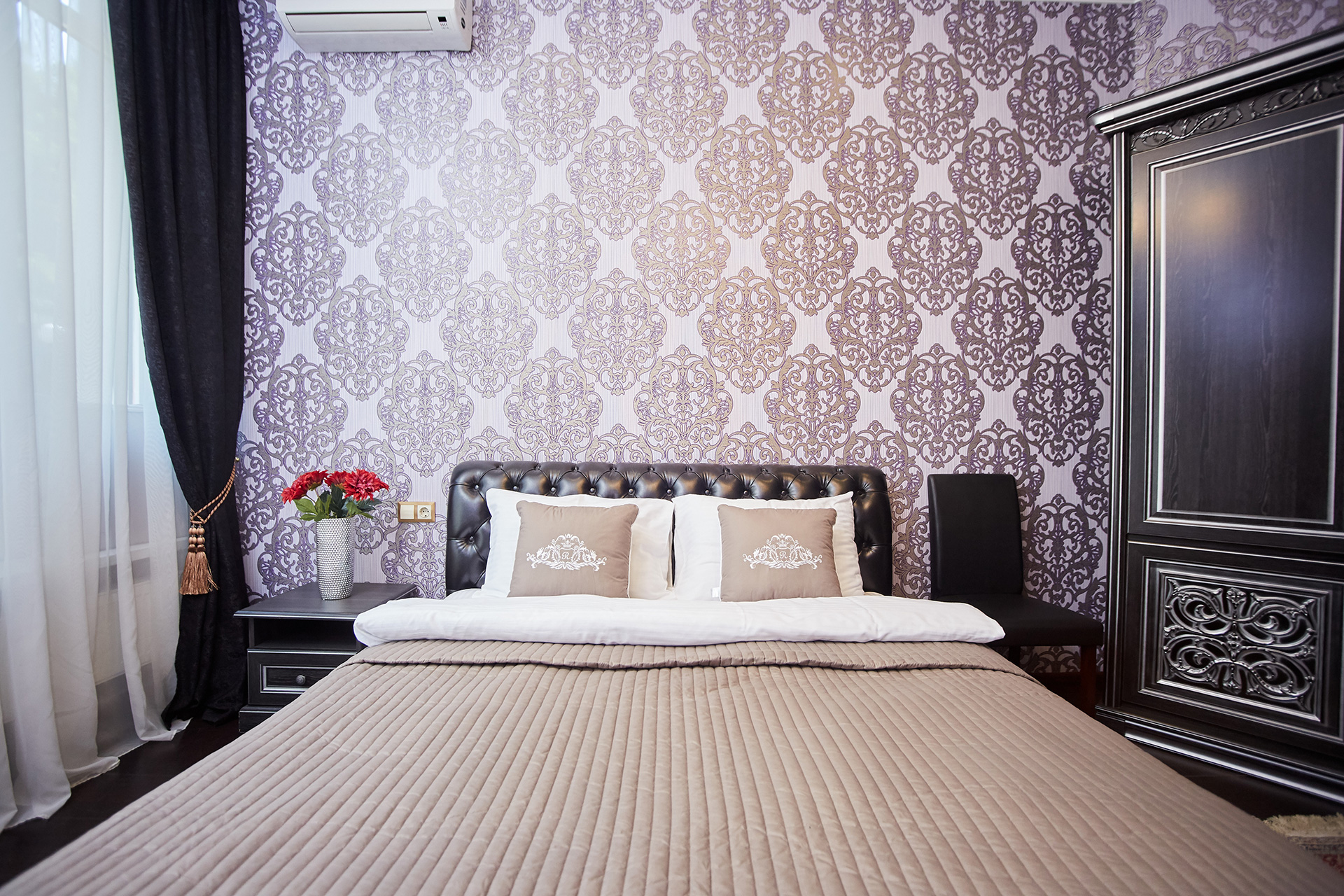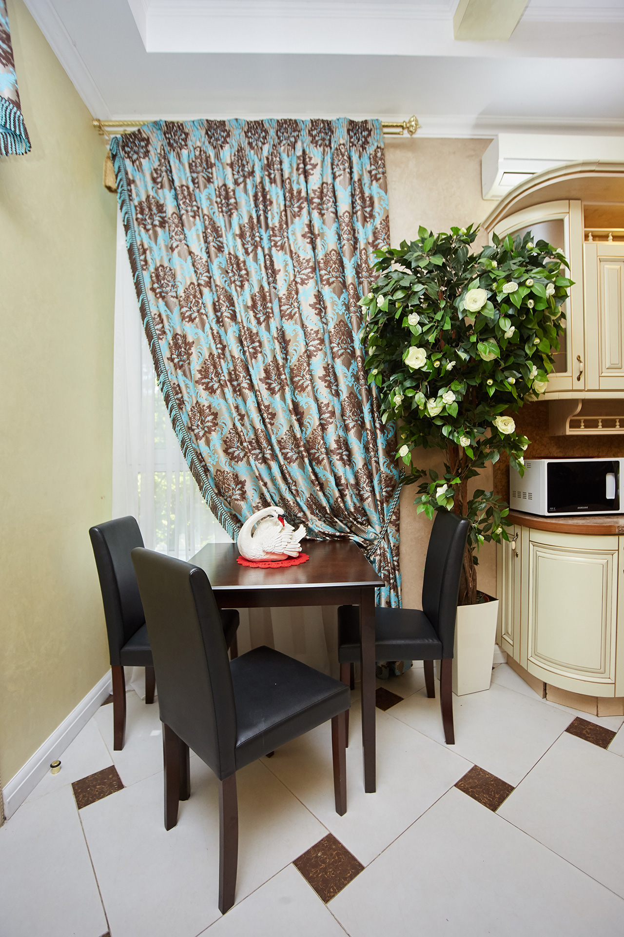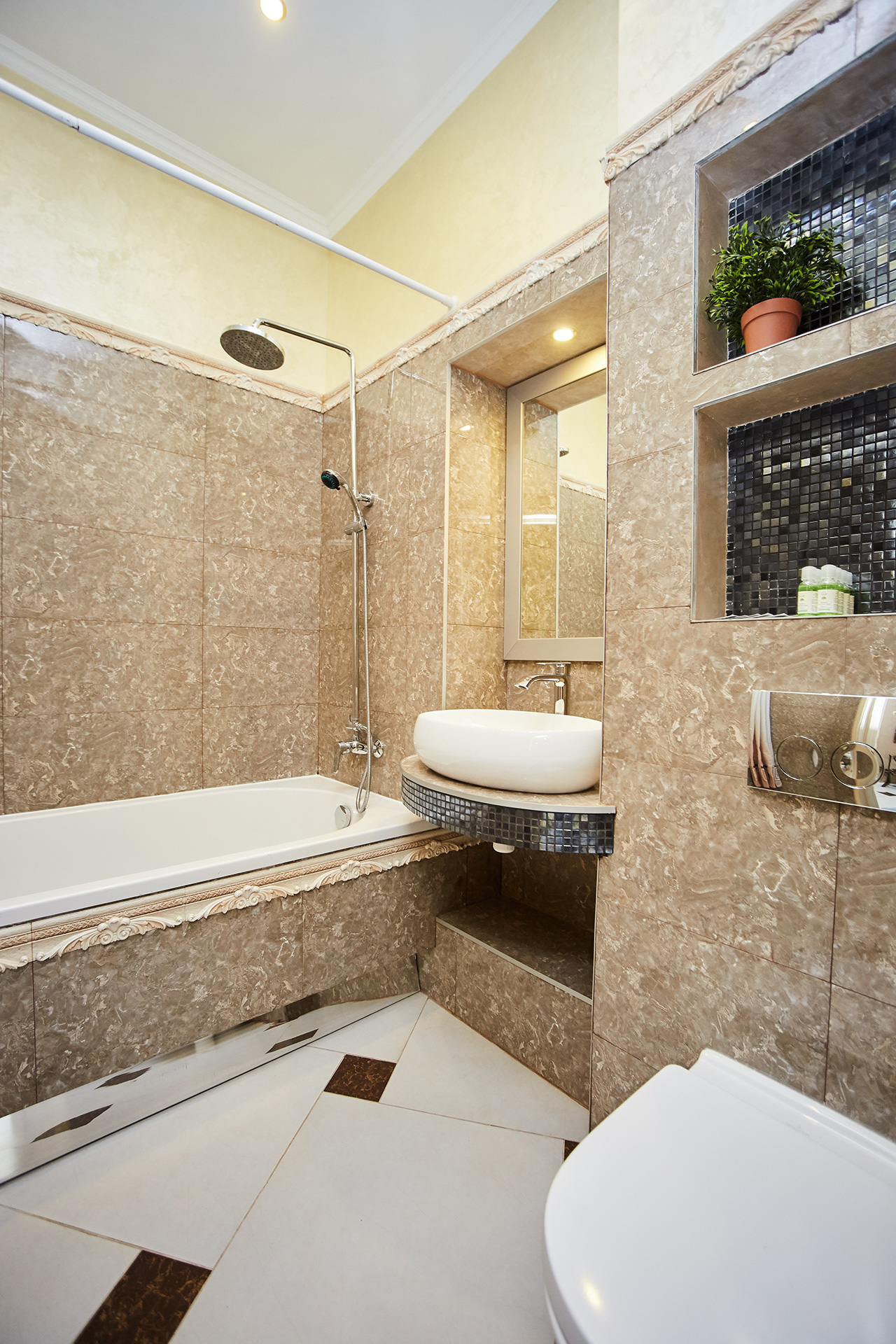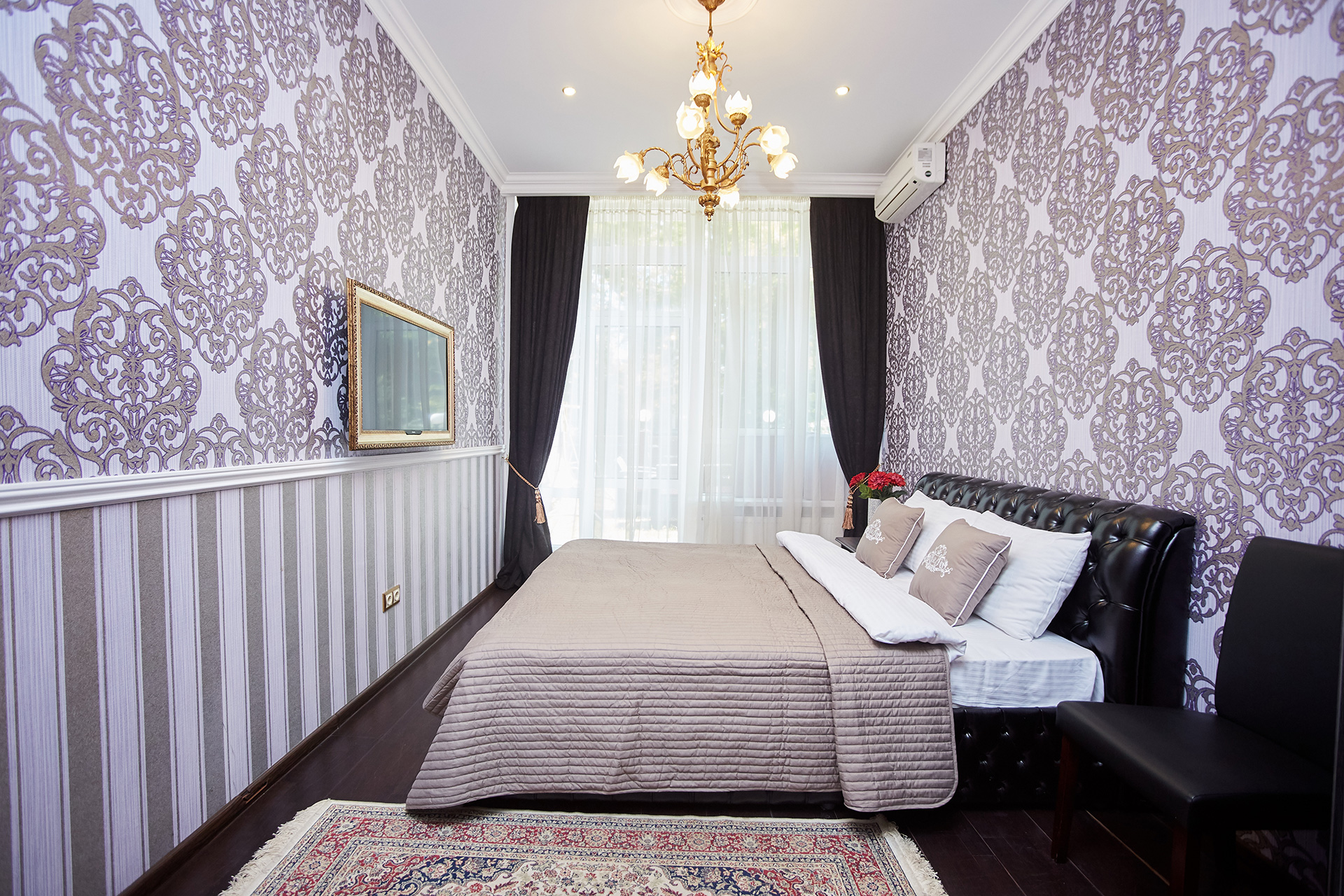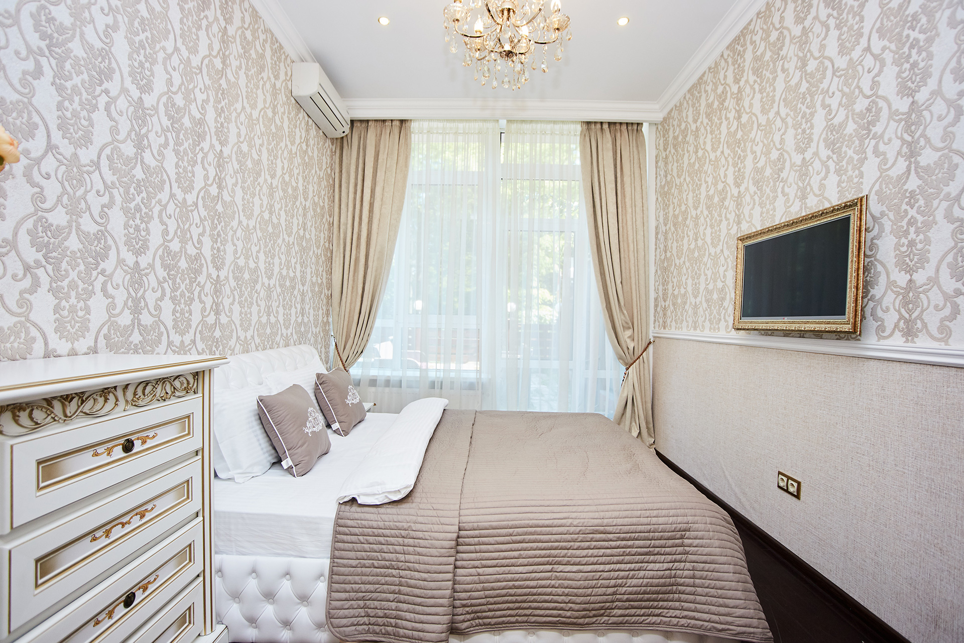 The exclusive spacious apartment is modern in interior and design in so called royal style. Arches, art paintings, mosaic elements in the bathroom, marble surfaces, expensive furniture, beautiful chandeliers and lamps, paintings, beautiful curtains, modern appliances, LCD TVs, a stylish, fully equipped kitchen create an atmosphere of luxury and comfort.