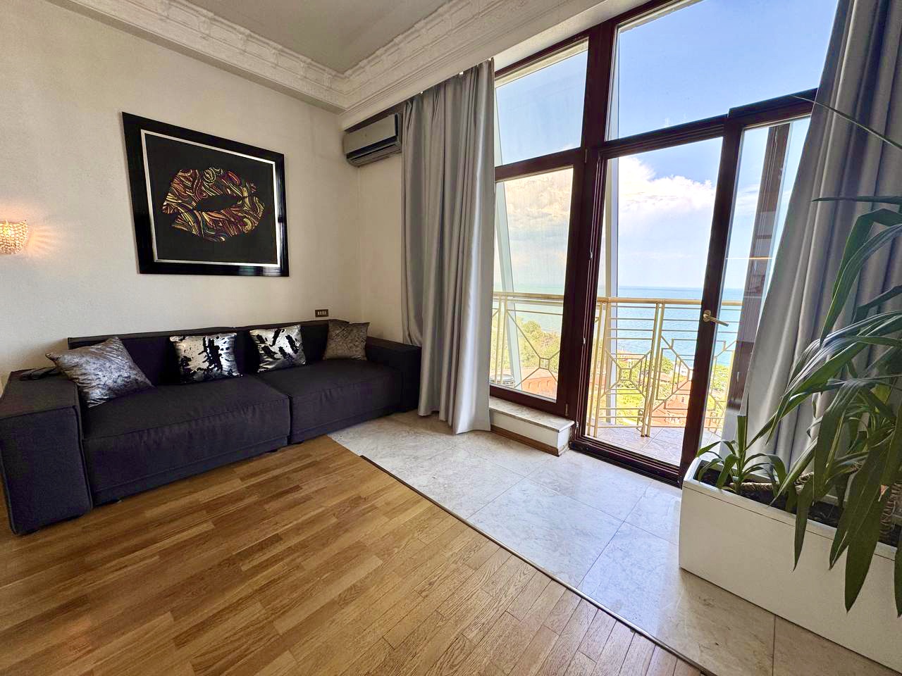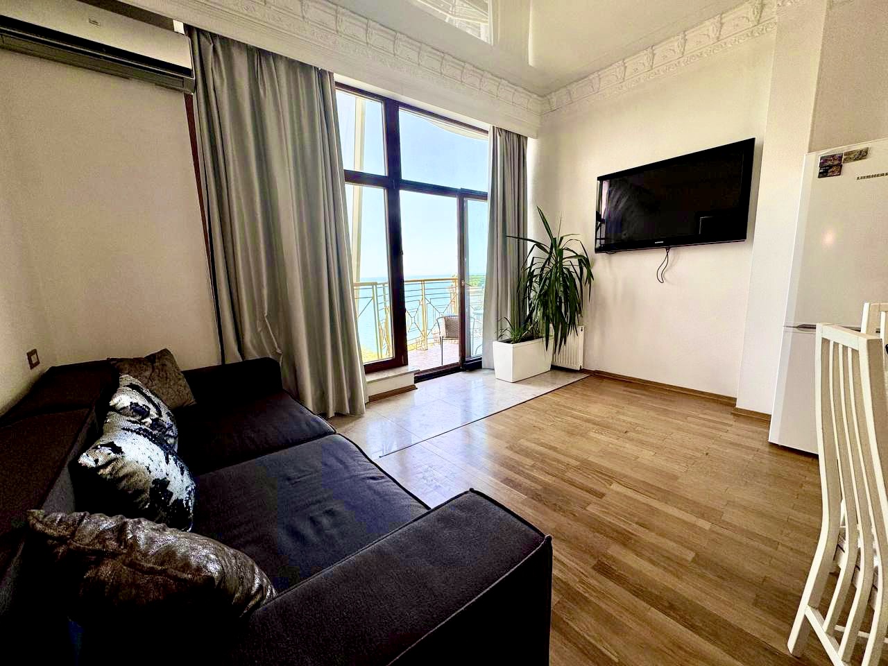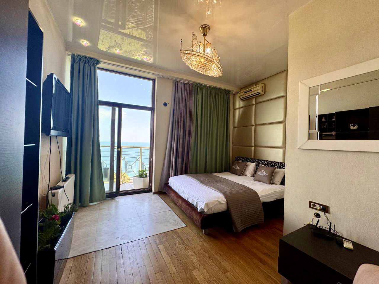 Роскошные ультрасовременные апартаменты, очень светлые и уютные, с потрясающим видом на морское побережье. Студийная планировка гостиной и кухни, отдельно спальня с большой двуспальной кроватью, в гостиной – диван, раскладывающийся в двуспальное место, кухня со стильными белыми фасадами, санузел с гидромассажным боксом. Дорогой интерьер, аксессуары, мебель, ЖК телевизоры , полное оснащение первоклассной техникой. Из гостиной – выход на балкон с мебелью для отдыха .