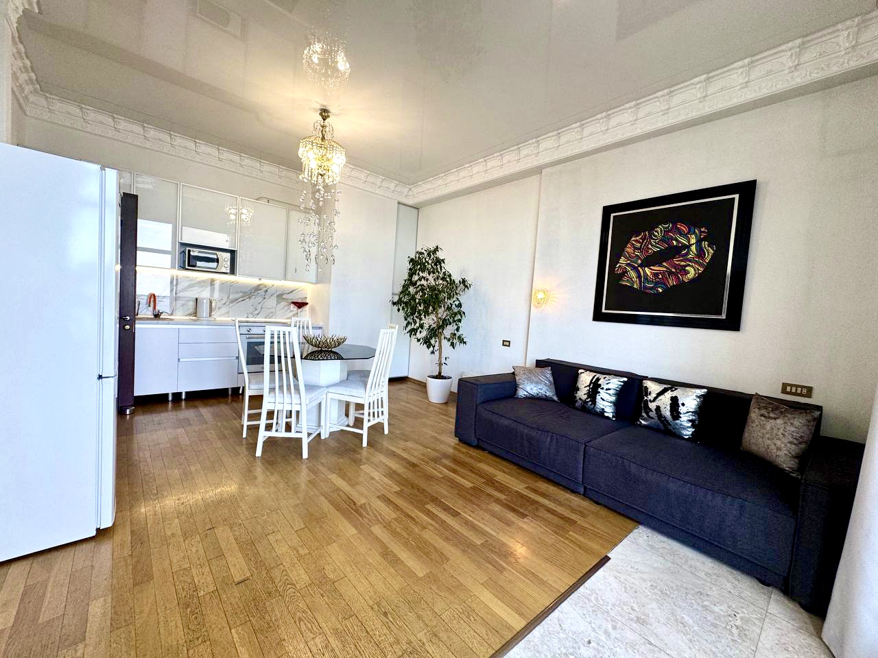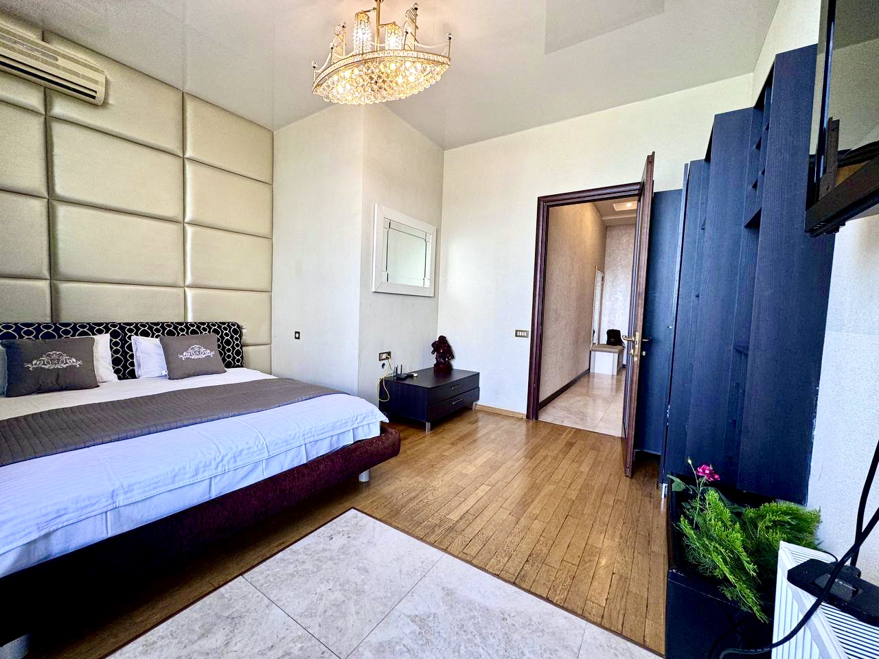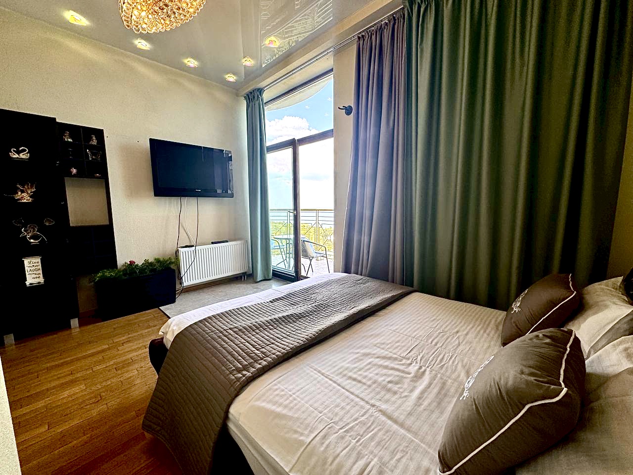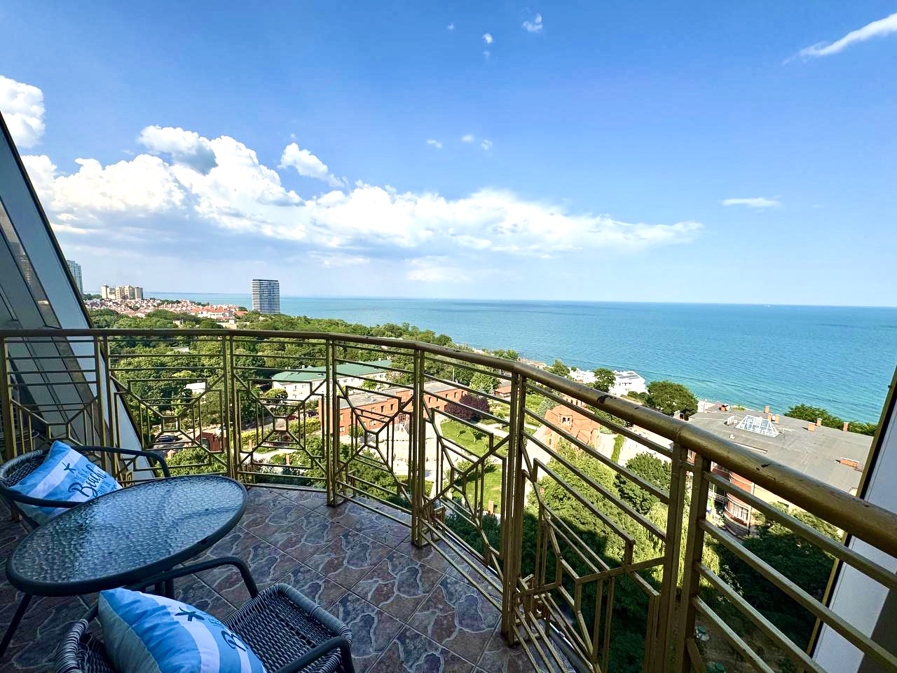 Роскошные ультрасовременные апартаменты, очень светлые и уютные, с потрясающим видом на морское побережье. Студийная планировка гостиной и кухни, отдельно спальня с большой двуспальной кроватью, в гостиной – диван, раскладывающийся в двуспальное место, кухня со стильными белыми фасадами, санузел с гидромассажным боксом. Дорогой интерьер, аксессуары, мебель, ЖК телевизоры , полное оснащение первоклассной техникой. Из гостиной – выход на балкон с мебелью для отдыха .