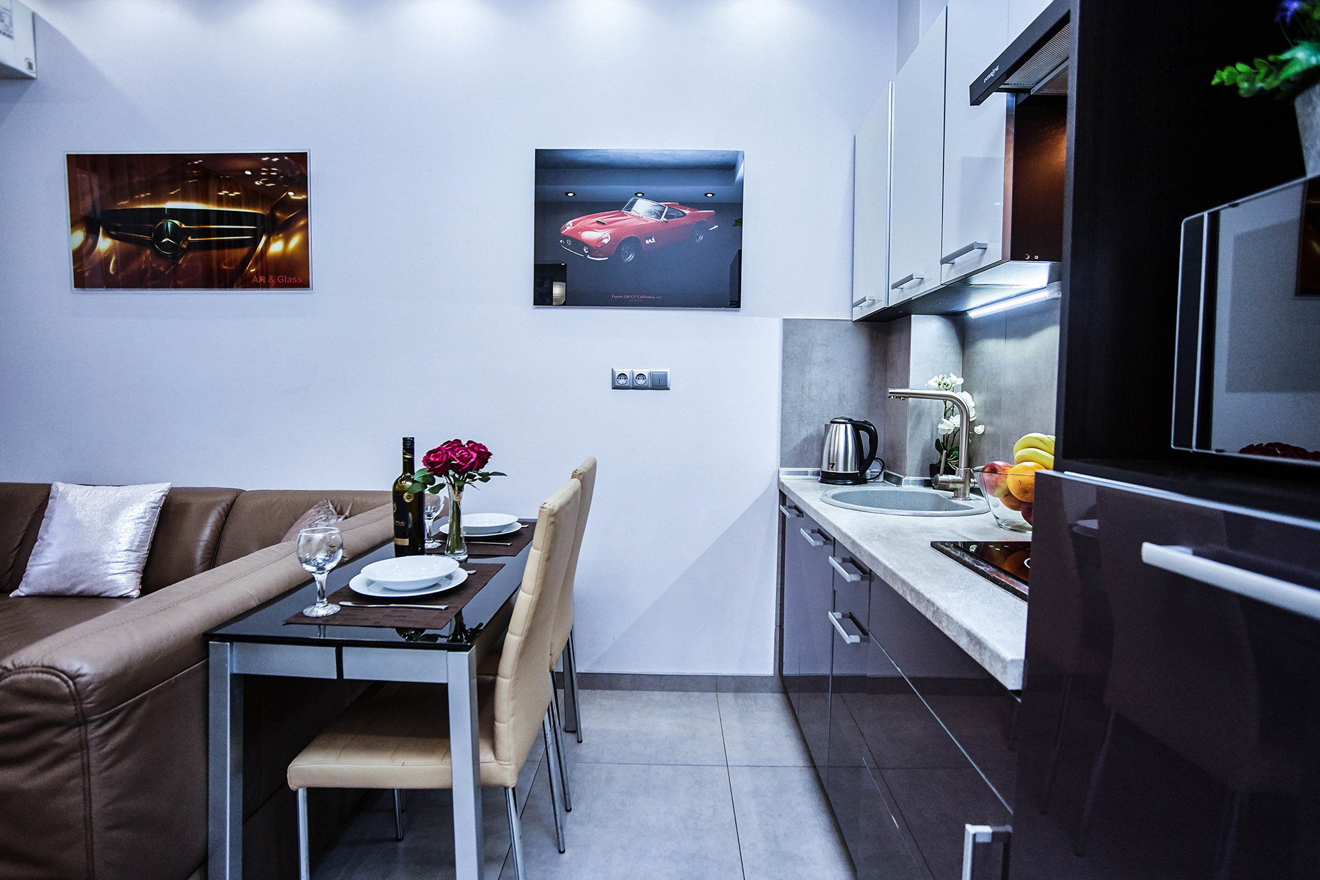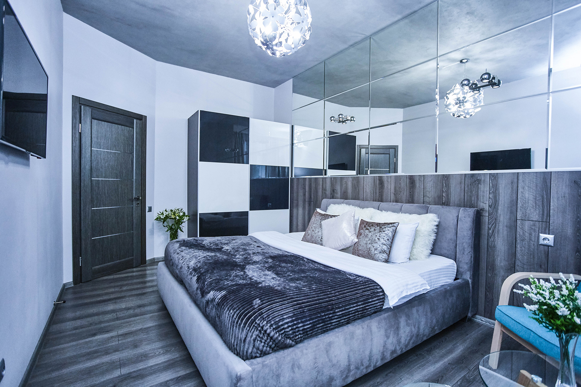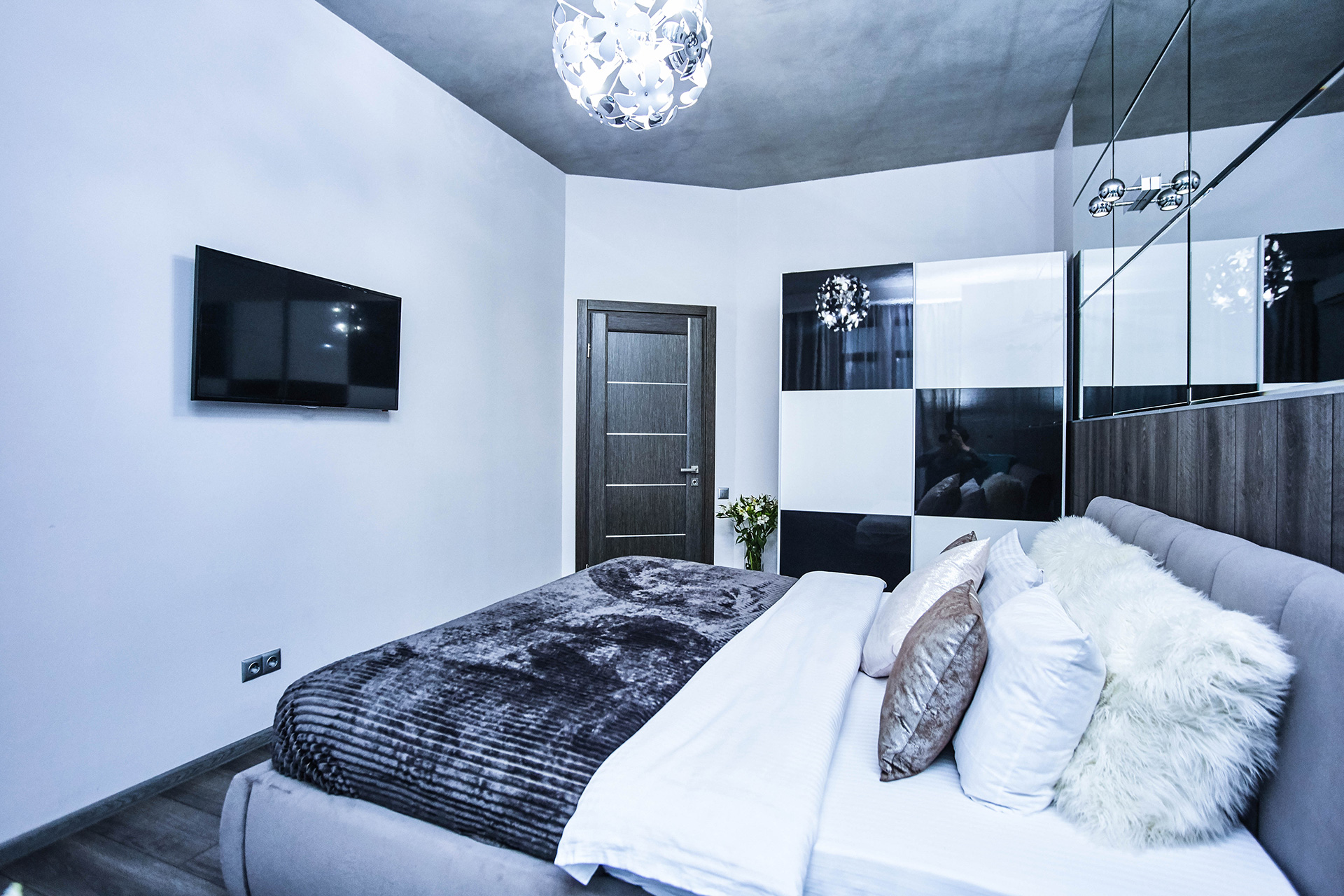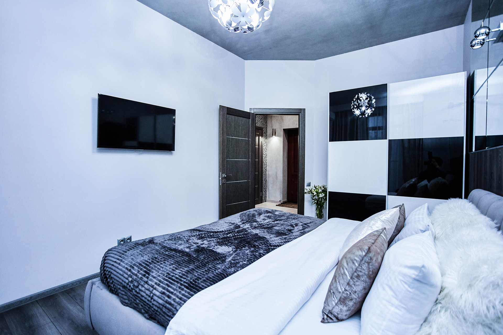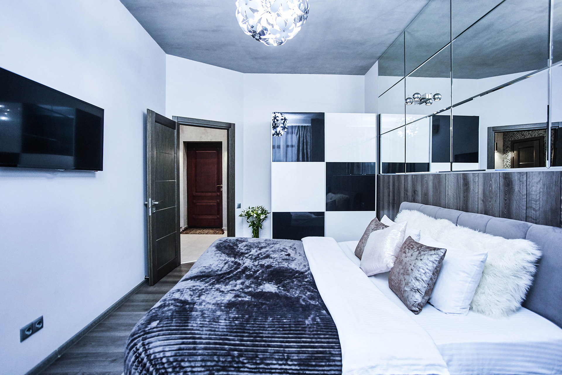 This spacious and cozy apartment is ultra-modern and stylish in design. It offers the living room with open kitchen and dining area. Comfortable design and leather sofa transformed into a double bed make your stay here a real pleasure. The bedroom offers a king-size bed. There are 2 LCD TVs with IP-TV in each room. The hall has a spacious closet. The bathroom offers a Jacuzzi for two people. Two balconies impress you with the wonderful view of the nearby part of the city.