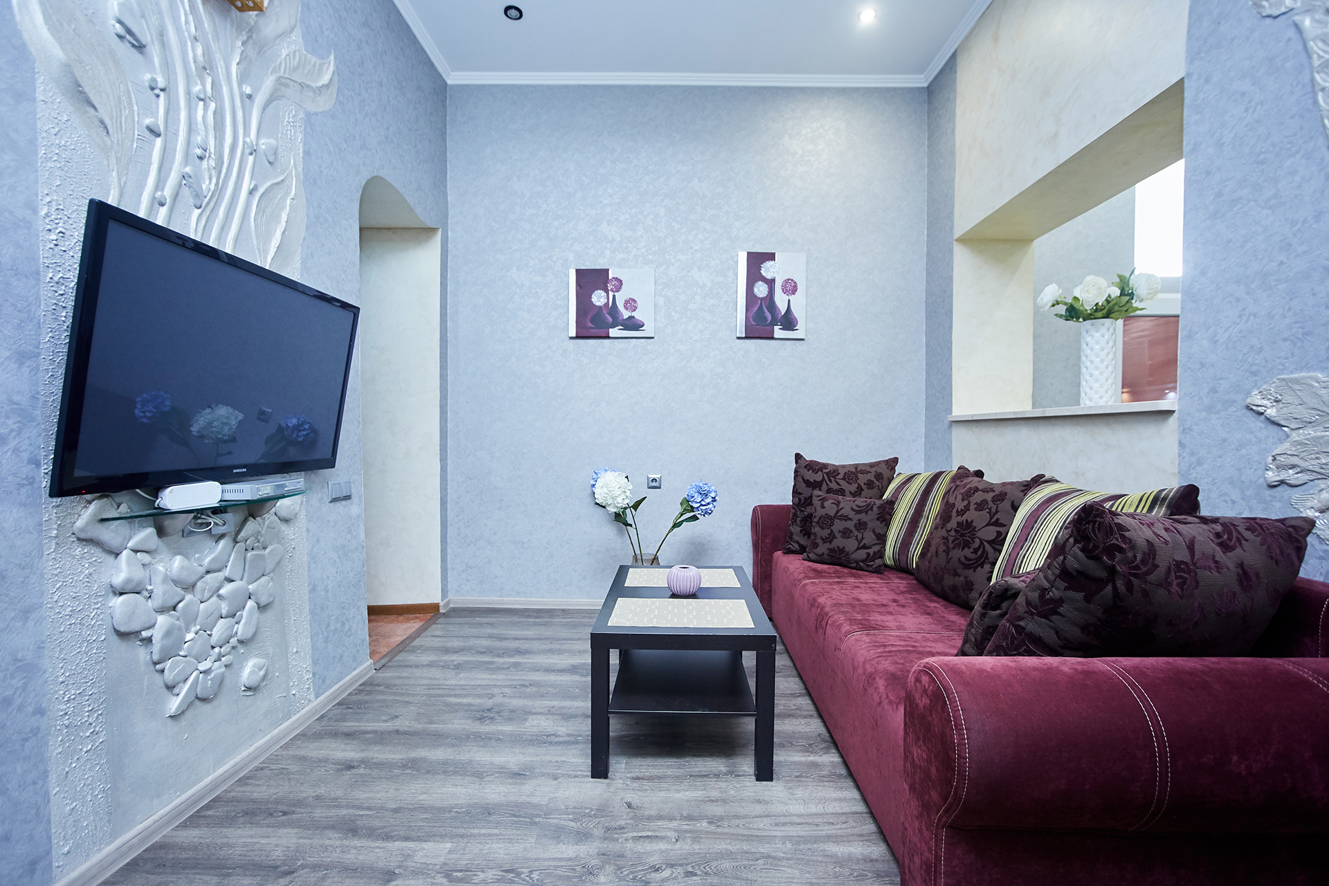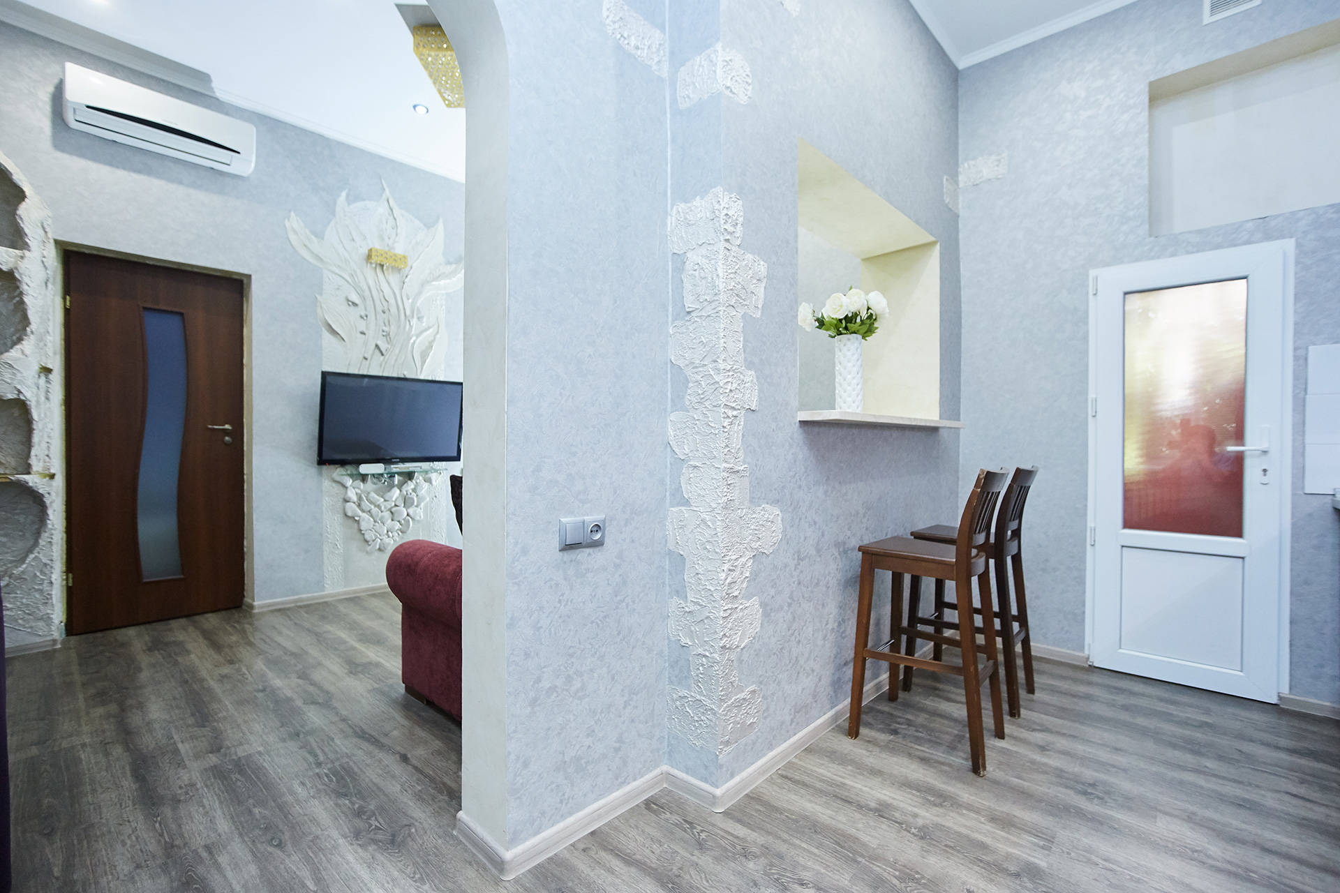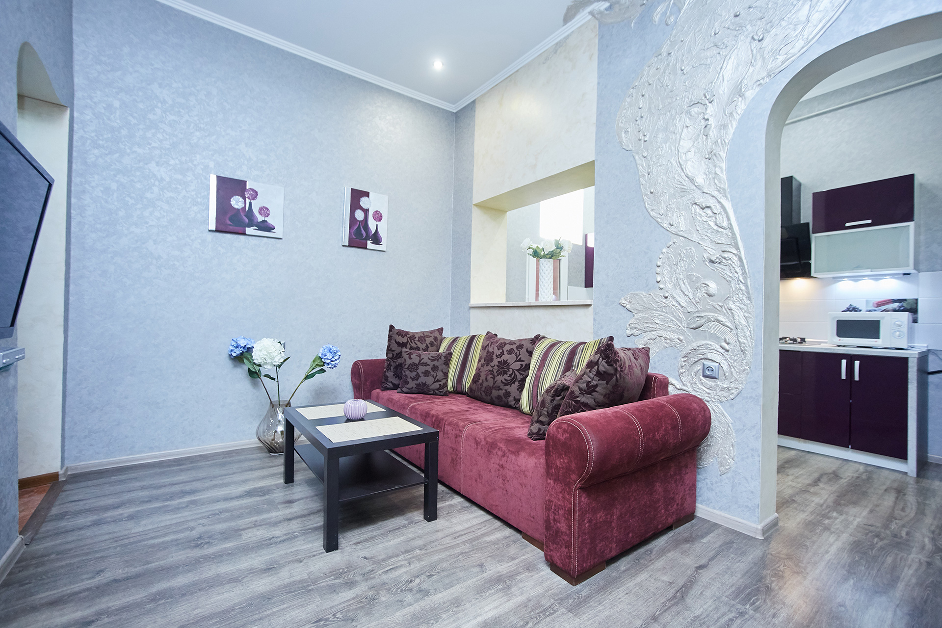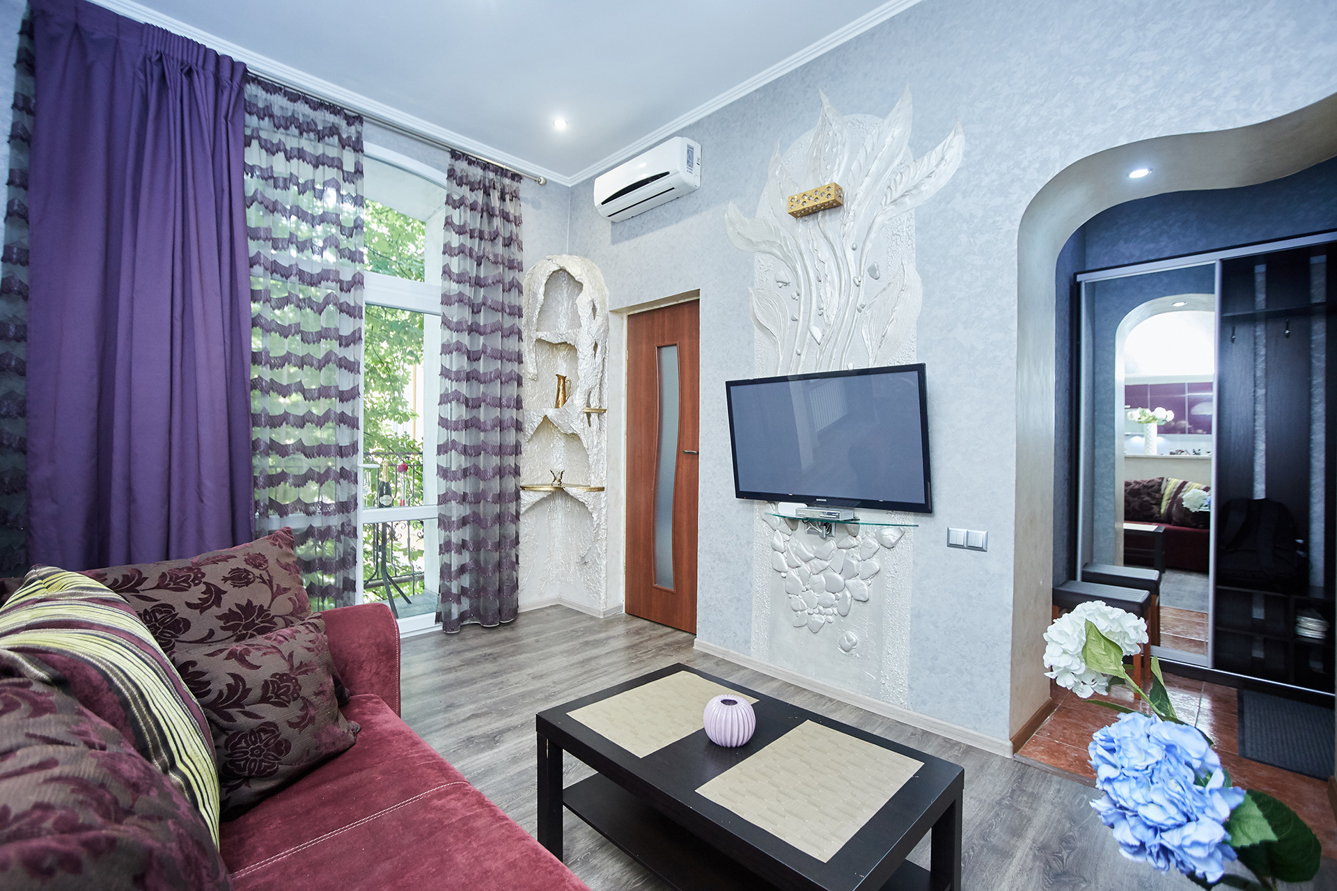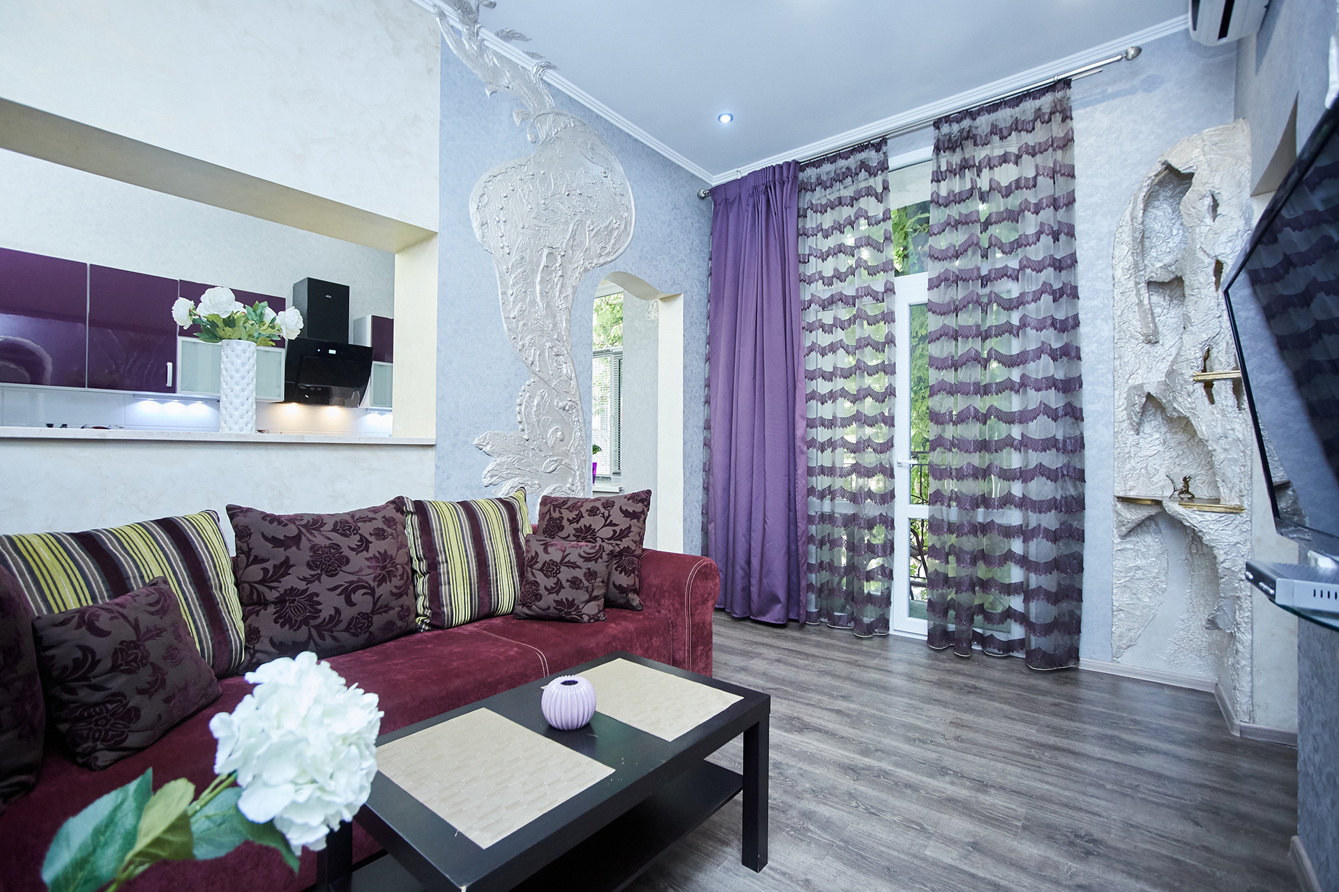 The bright and stylish apartment is modern in design and offers wonderful décor. It has an open plan kitchen with breakfast bar and a living room. The living room offers a comfortable sofa easily transformed into a double bed and a flat-screen TV on the wall. What makes this apartment especially interesting is the fact that is beautifully presented and decorated. All these things create a special romantic atmosphere.
