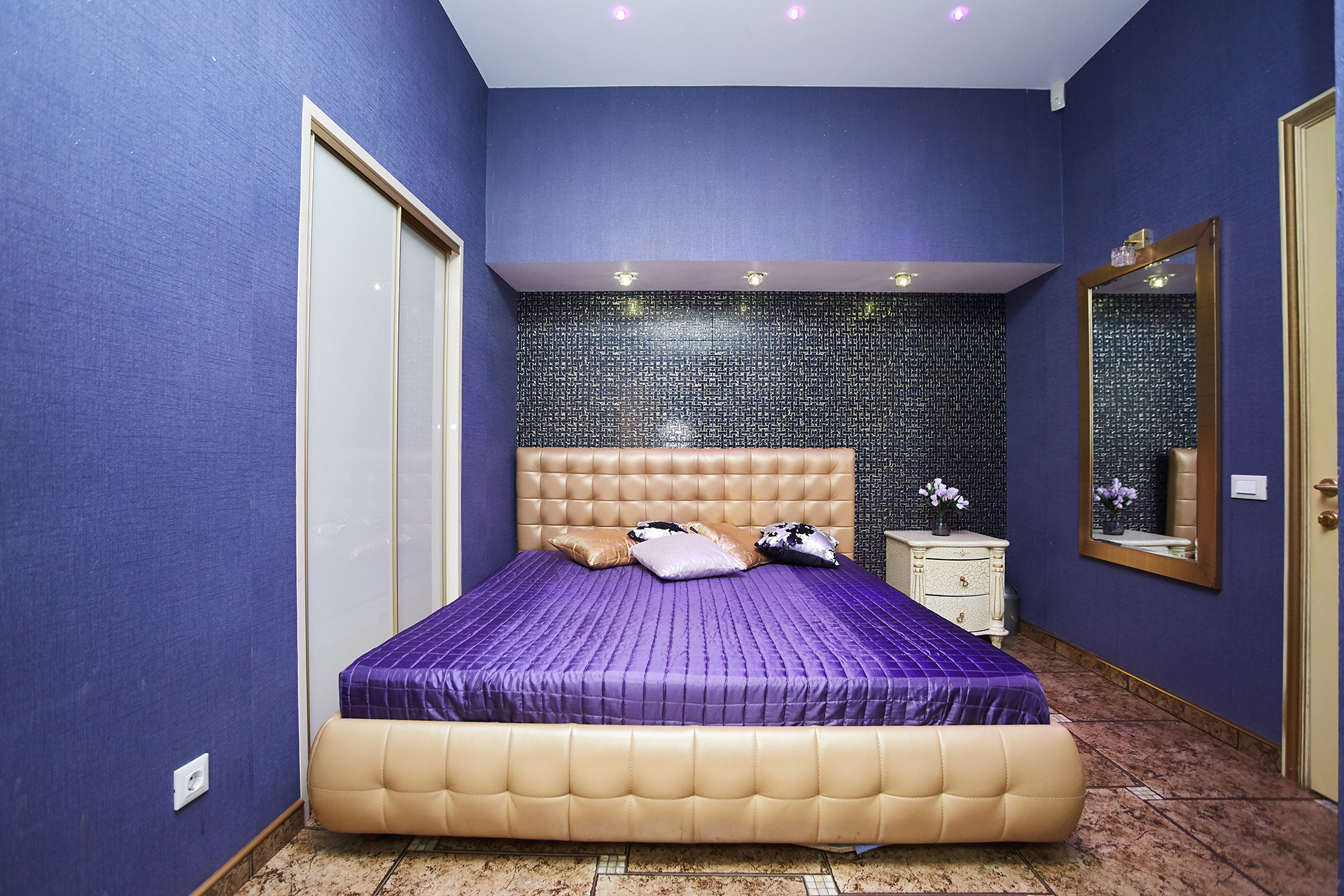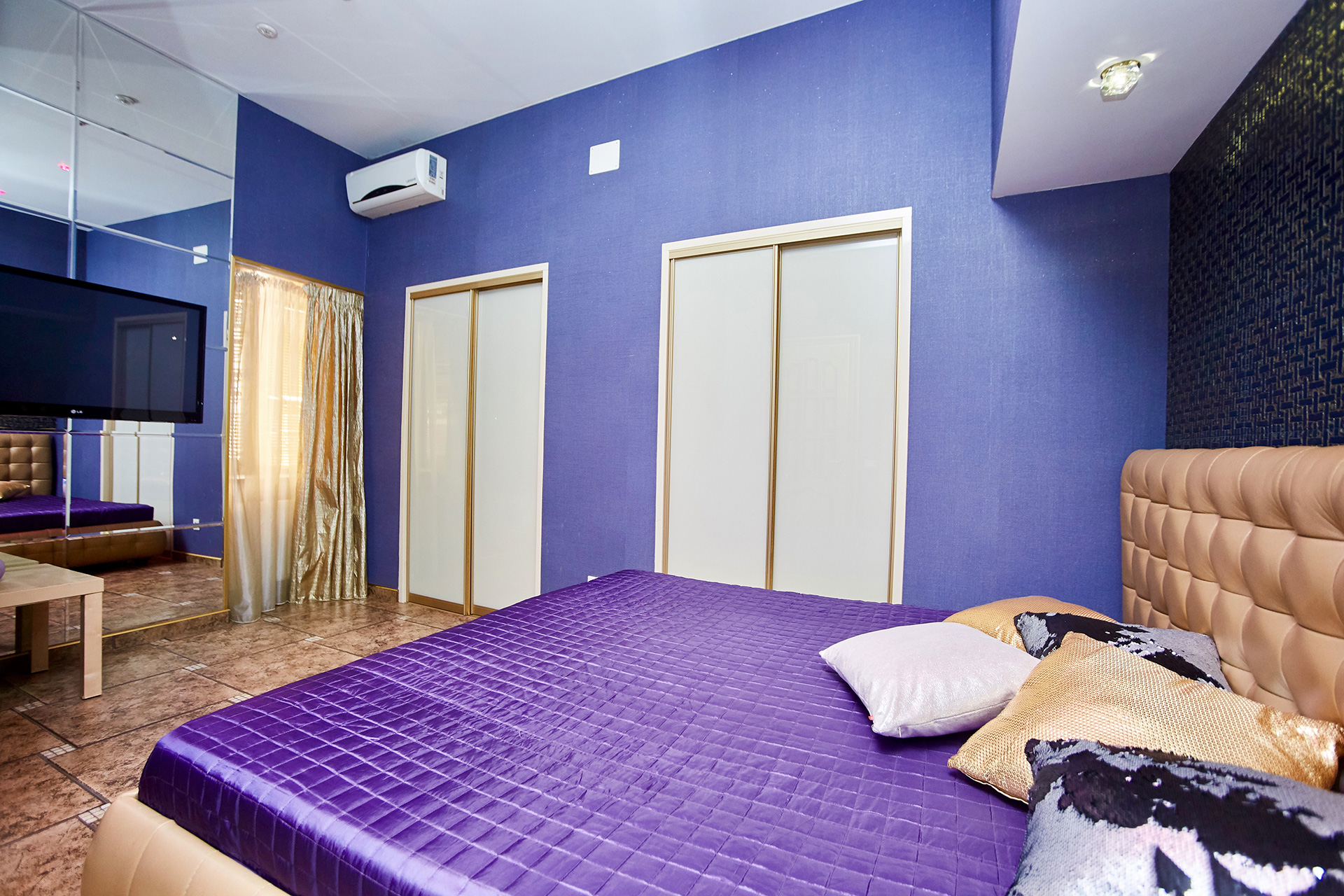 - уютная спальня, в которой есть кровать размера “king-size” с отделкой из натуральной кожи и ЖК TV 42”;