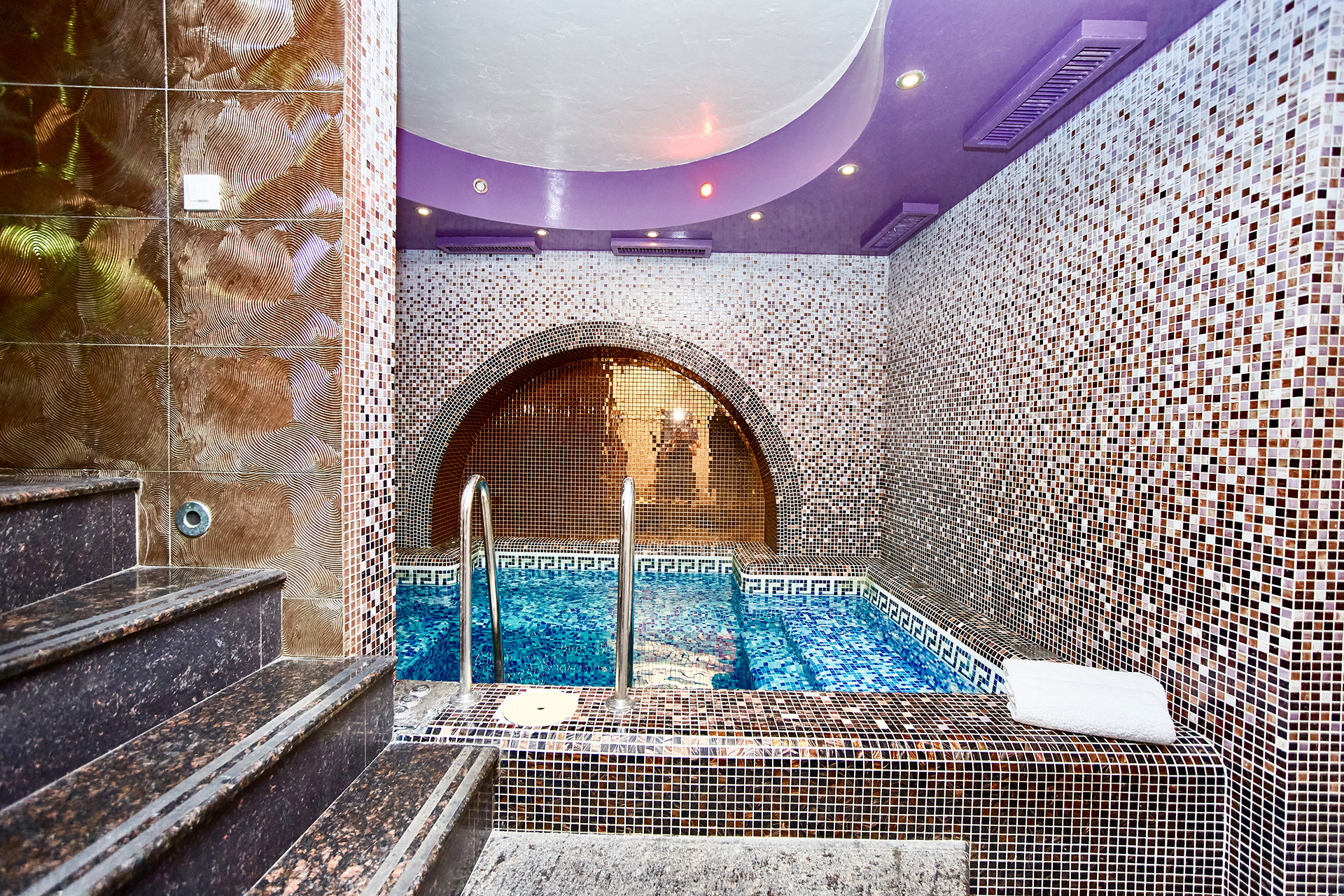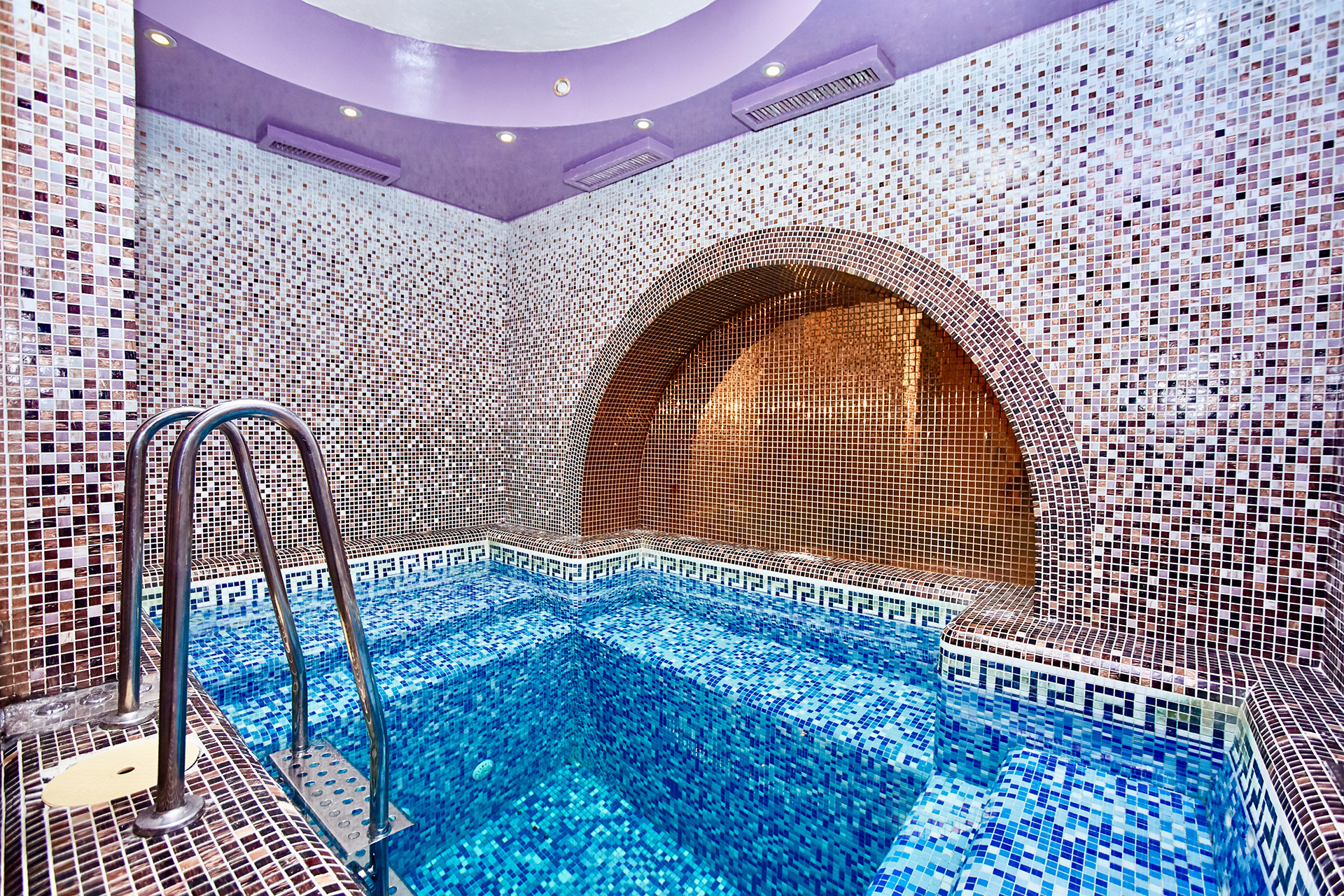- тёплый бассейн (t = 29-30°C) с фильтрацией и современной системой очистки, гидромассажем, подсветкой;